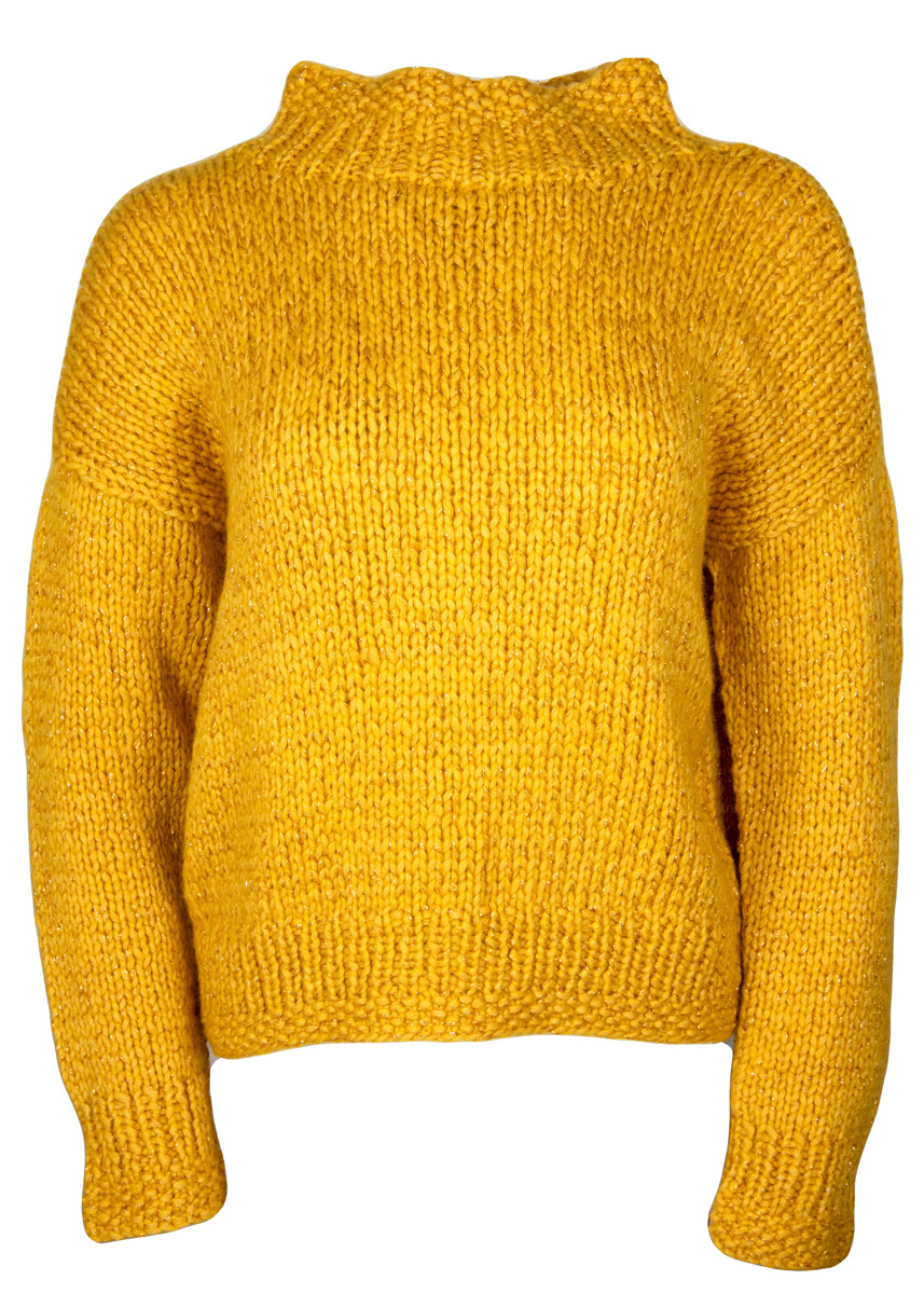 400 (450–500) г желтой (цв. 15) пряжи Lala Berlin Lovely Cotton (75% овечьей шерсти (мериносовой шерсти суперфайн), 25% хлопка, 90 м/50 г) и 100 (125–125) г желто-золотистой (цв. 3) пря- жи Brillino (83% вискозы, 17% металлизи- рованного волокна, 200 м/25 г) фирмы Lana Grossa; прямые спицы № 7 и № 8, круговые спицы № 7 длиной 50 см