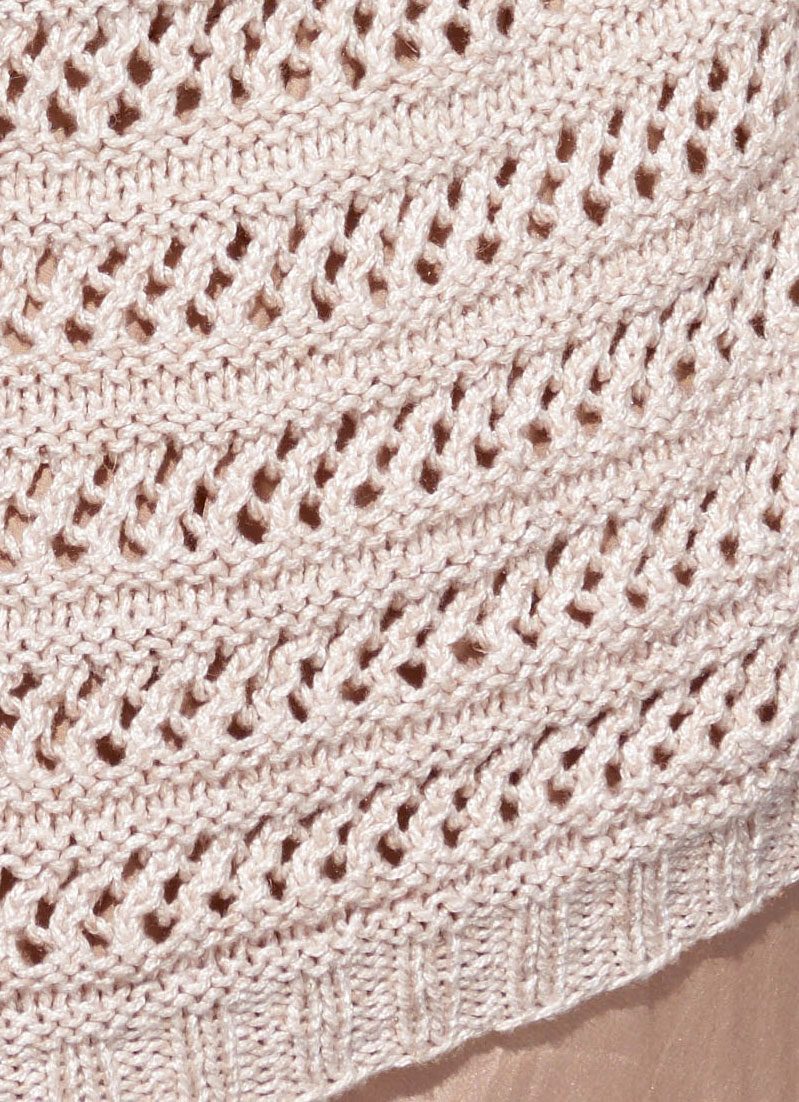 400 (450 – 500) г бежевой (цвет 62) пряжи Linarte (40 % вискозы, 30 % хлопка, 20 % льна, 10 % полиамида, 125 м/50 г) фирмы Lana Grossa; прямые спицы № 3,5 и 4,5, круговые спицы № 4,5 длиной 80 см и № 3,5 длиной 60 см.