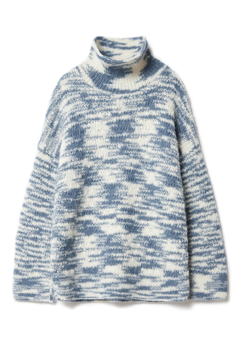 550 (600) г белой суровой/серо-синей (цв. 204) пряжи Natural Alpaca Pelo (63% хлопка, 31% альпака бэби, 6% шерсти мерино, 125 м/50 г) фирмы Lana Grossa; прямые спицы № 3 и № 4, круговые спицы № 3 длиной 50 см