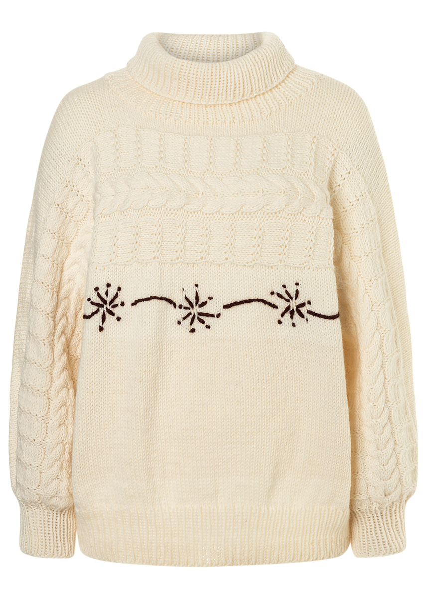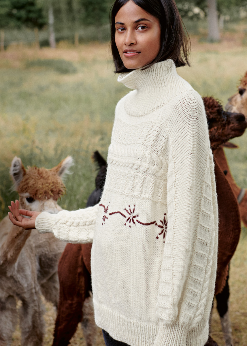 650 г белой суровой (цв. 301) и 50 г цвета бургундского вина (цв. 315) пряжи Landlust Alpaka Merino 100 (50% альпака бэби, 50% шерсти мерино, 100 м/50 г) фирмы Lana Grossa; 2 пары кру- говых спиц № 6 длиной 100 см, круговые спицы № 6 длиной 50 см, чулочные спицы № 5, 1 вспомогательная спица для кос, игла для вышивания.