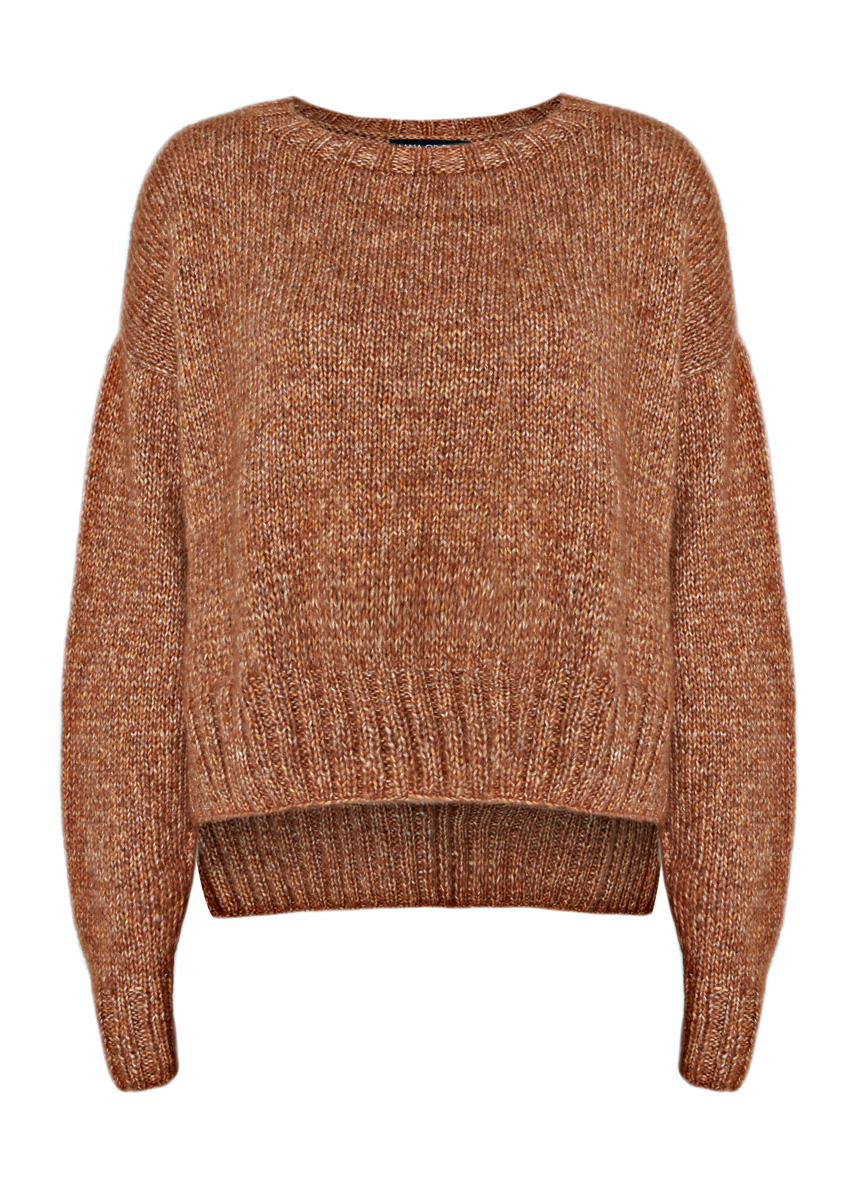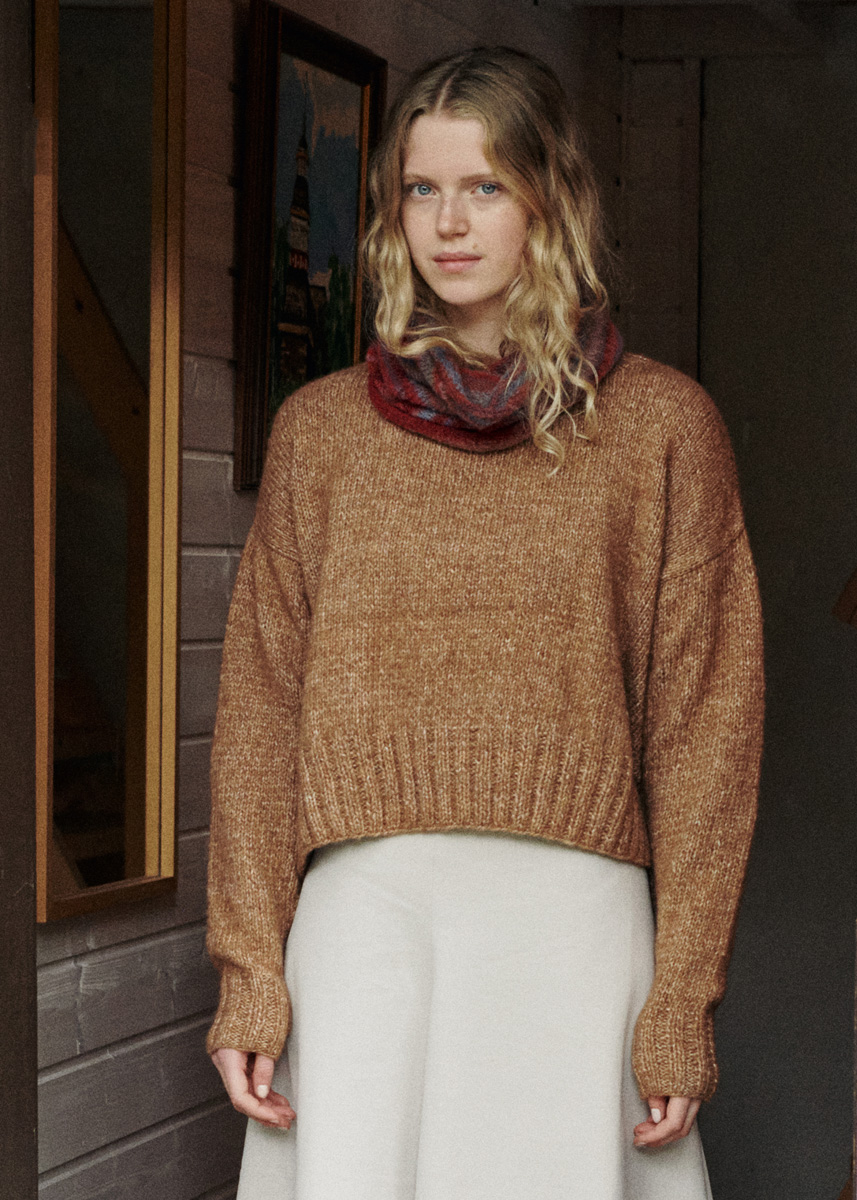 Lana Grossa-Qualität „Sara“ (65 % хлопок, 30 % беби альпака, 5 % шерсть (меринос), длина нити 125 m/50 g): ок. 400 (450) г легко коричневый меланжевый (цв. 18); сп. № 5 и 6, 1 кр. сп. № 5, 60 см длиной