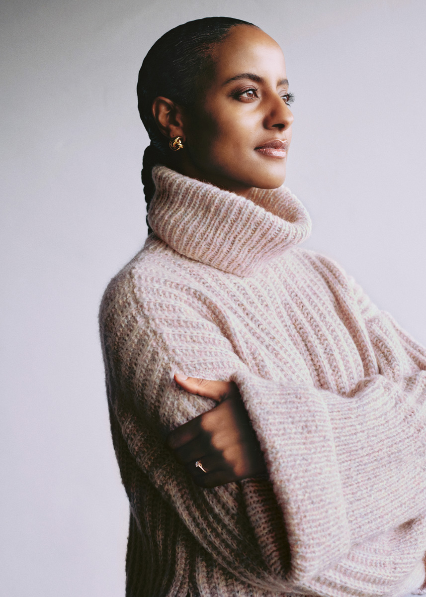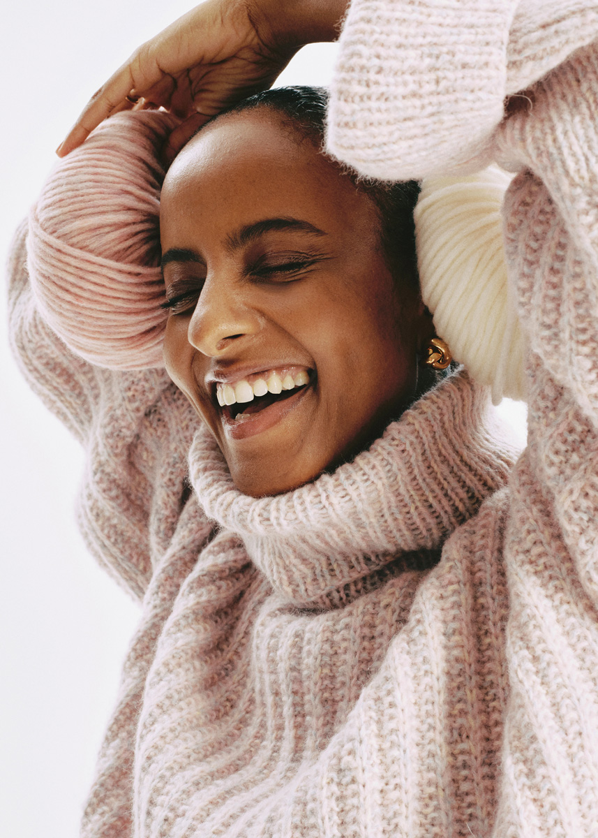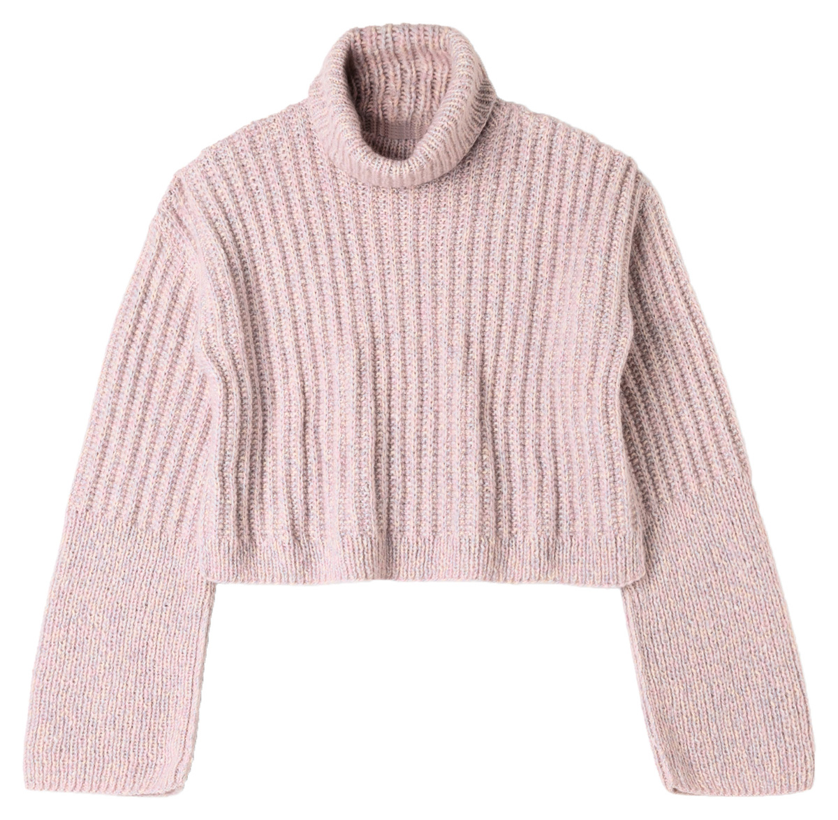 550 (600–650) г розовой/цвета вани- ли/пастельно-синей меланжевой (цв. 23) пряжи Sara (65% хлопка, 30% альпака бэби, 5% шерсти мерино, 125 м/50 г) фирмы Lana Grossa; прямые спицы № 3,5 и № 4, круговые спицы № 3,5 длиной 40 см