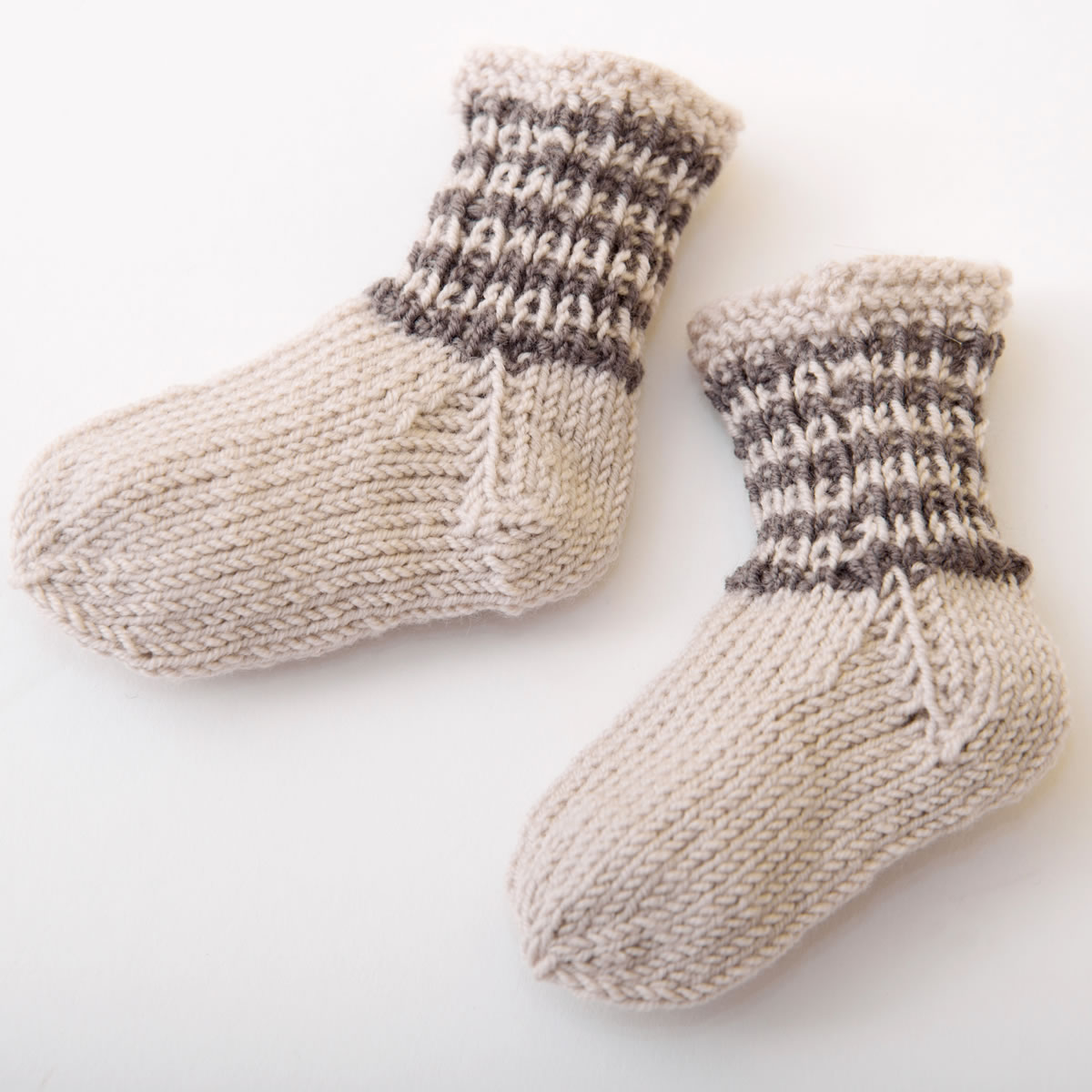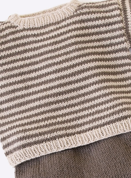 100 г серо-коричневой (цвет 211) и 50 г цвета грежа (цвет 212) пряжи Cool Wool Baby фирмы Lana Grossa (100 % шерсти, 220 м/50 г); прямые спицы № 3, круговые спицы № 3 длиной 40 см, набор чулочных спиц № 3, вязальный крючок № 2,5; 1 пуговица и резинка