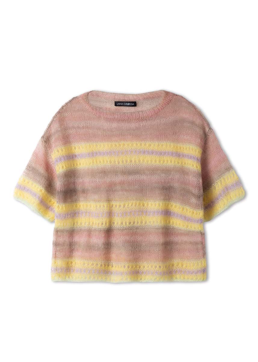 Lana Grossa-Qualität „Silkhair“ (70 % мохер (суперкид), 30 % шёлк, длина нити = ca 210 m/25 g): ок 25 (25 - 25 - 25) г сирень (цв 173), ок 25 (25 - 25 - 25) г бледно- зелёный (цв 211), ок 25 (25 - 25 - 25) г жёлтый (цв 158), Lana Grossa-Qualität „Cottonhair“ (70 % мохер (суперкид), 30 % хлопок, длина нити = ca 450 m/50 g): ок 50 (50 - 100 - 100) г мальва/ розовый/ мягко розовый/бежевый/серо- коричневый (цв 105); сп. № 4,5 и 5; 1 кр. сп. № 4,5.