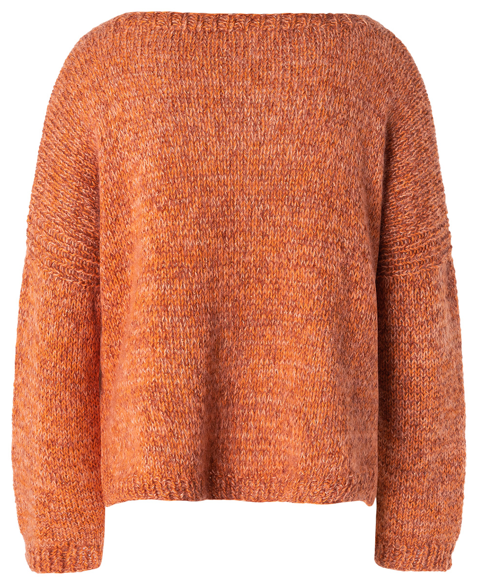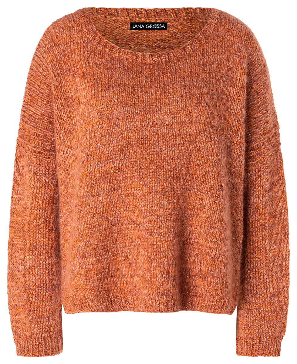 Lana Grossa-Qualität „Silkhair” (70 % мохер (суперкид), 30 % шёлк, длина нити = ca. 210 m/25 g): ок. 100 (125) г лососевый (цв. 159), Lana Grossa-Qualität „Ecopuno” (72 % хлопок, 17 % шерсть (меринос), 11 % (беби) альпака, длина нити = ca. 215 m/50 g): ок. 250 (300) г яффа оранжевый (цв. 5) и Lana Grossa-Qualität „Brillino” (83 % вискоза, 17 % металл. фибра, длина нити = ca. 200 m/25 g): ок. 125 (150) г золотисто-каштановый (цв. 1); сп. № 5, 5,5 и 6, 1 кр. сп. № 5, длиной 60 см