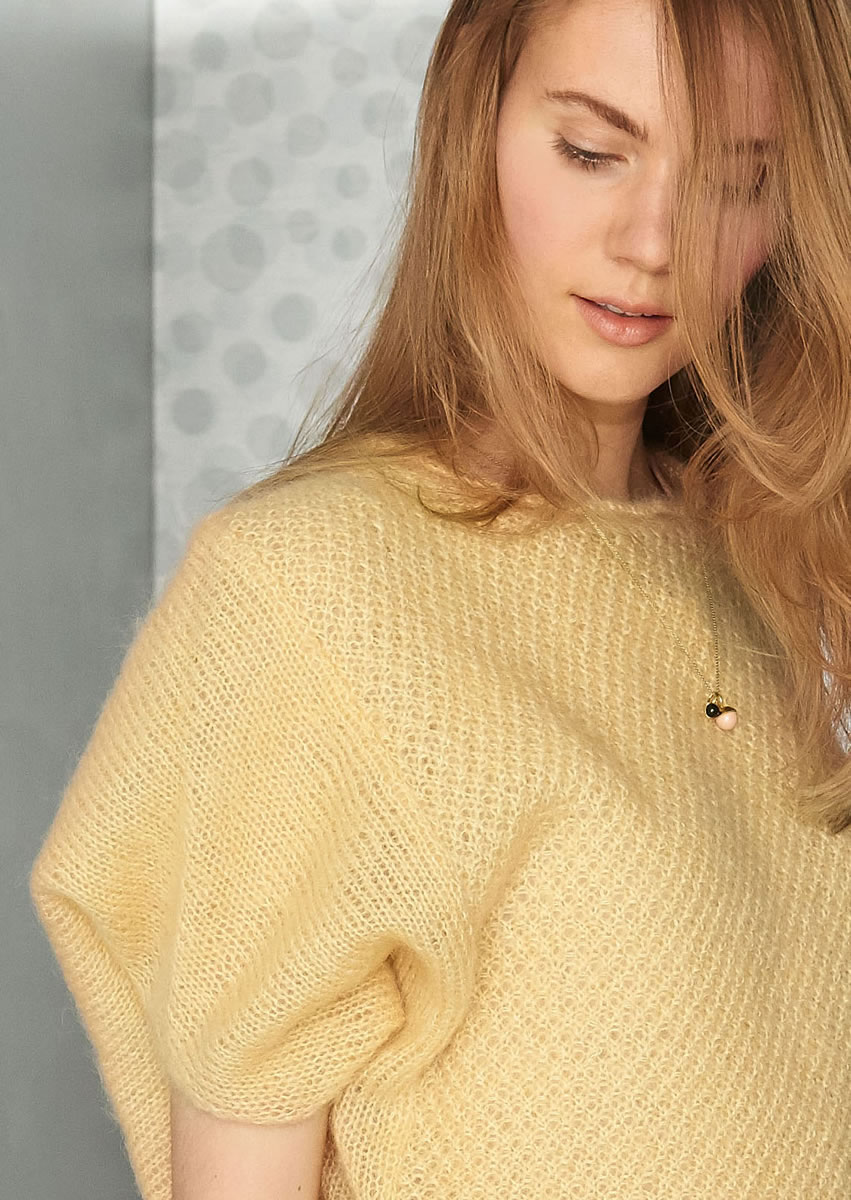 150 (175 - 200) г персиковой (цвет 91) пряжи Silkhair (70% мохер, 30% шелк, 210 м/25 г) фирмы Lana Grossa; контрастная нить подходящей толщины, прямые спицы № 5 и круговые спицы № 4 длиной 40 см, а также вспомогательная спица для отложенных петель.