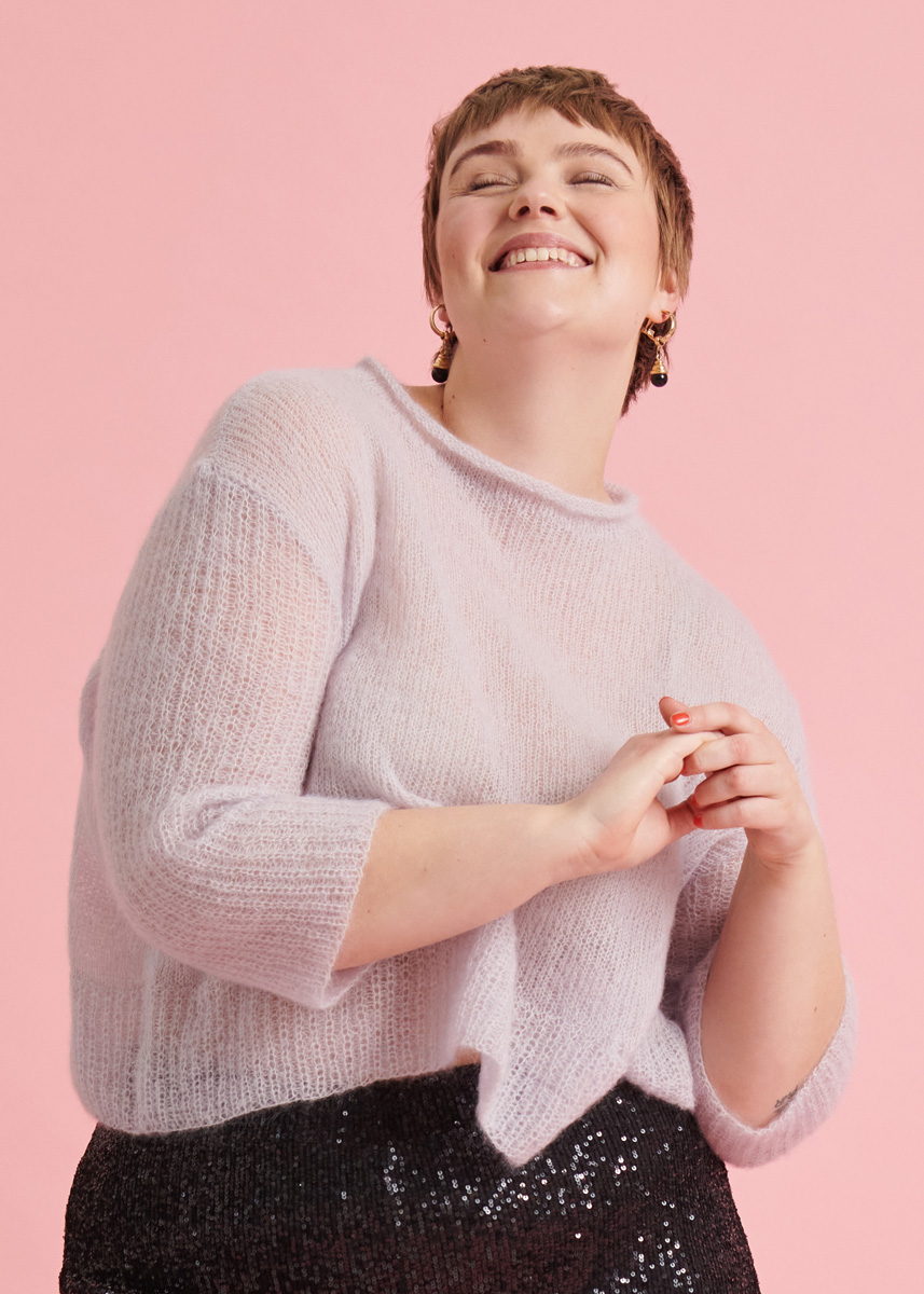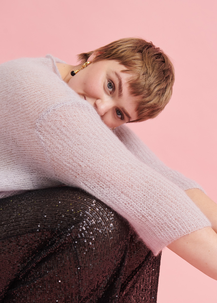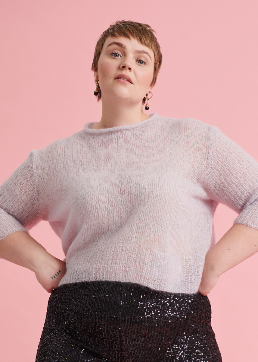 Lana Grossa-Qualität „Silkhair“ (70 % мохер (суперкид), 30 % шёлк, длина нити 210 m/25 g): ок. 175 (200– 225) г серо фиолетовый (цв. 152); сп. № 3,5, 4 и 6, 1 кр. сп. № 3,5, длиной 50 см.