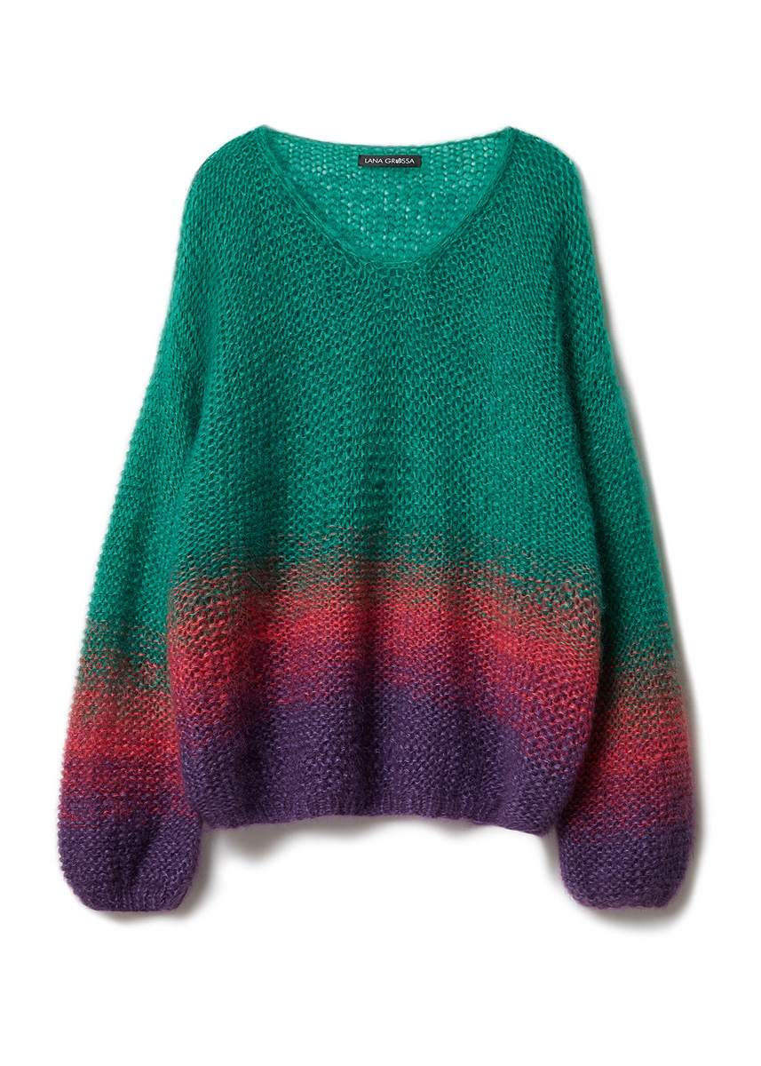 Lana Grossa-Qualität „Silkhair“ (70 % мохер (суперкид), 30 % шёлк, длина нити = ок. 210 m/25 g): ок 200 (200 - 225 - 250) г изумрудный (цв 156), ок 75 (75 - 100 - 100) г красная клубника (цв 147), ок 100 (100 - 100 - 125) г темно фиолетовый (цв 193); сп. № 8 и 10.
