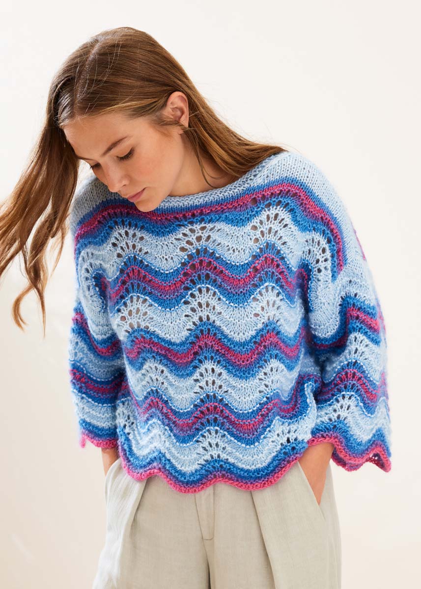 Lana Grossa-Qualität „Silkhair“ (70 % мохер (суперкид), 30 % шёлк, длина нити = ca 210 m/25 g): ок 25 (25) г фуксия (цв 172), ок 25 (25) г лавандовый (цв 163), ок 75 (75) г мягко-синий (цв 201) и ок 50 (50) г василек (цв 132); Lana Grossa-Qualität „Summer Softness“ (80 % хлопок (био), 20 % шерсть (меринос суперфейн), длина нити = ca 130 m/50 g): ок 50 (100) г пинк (цв 8), ок 50 (100) г лиловый (цв 9), ок 200 (250) г синяя пастель (цв 17), ок 150 (200) г джинс- синий (цв 16); сп. № 6; 1 кр. сп. № 5,5.