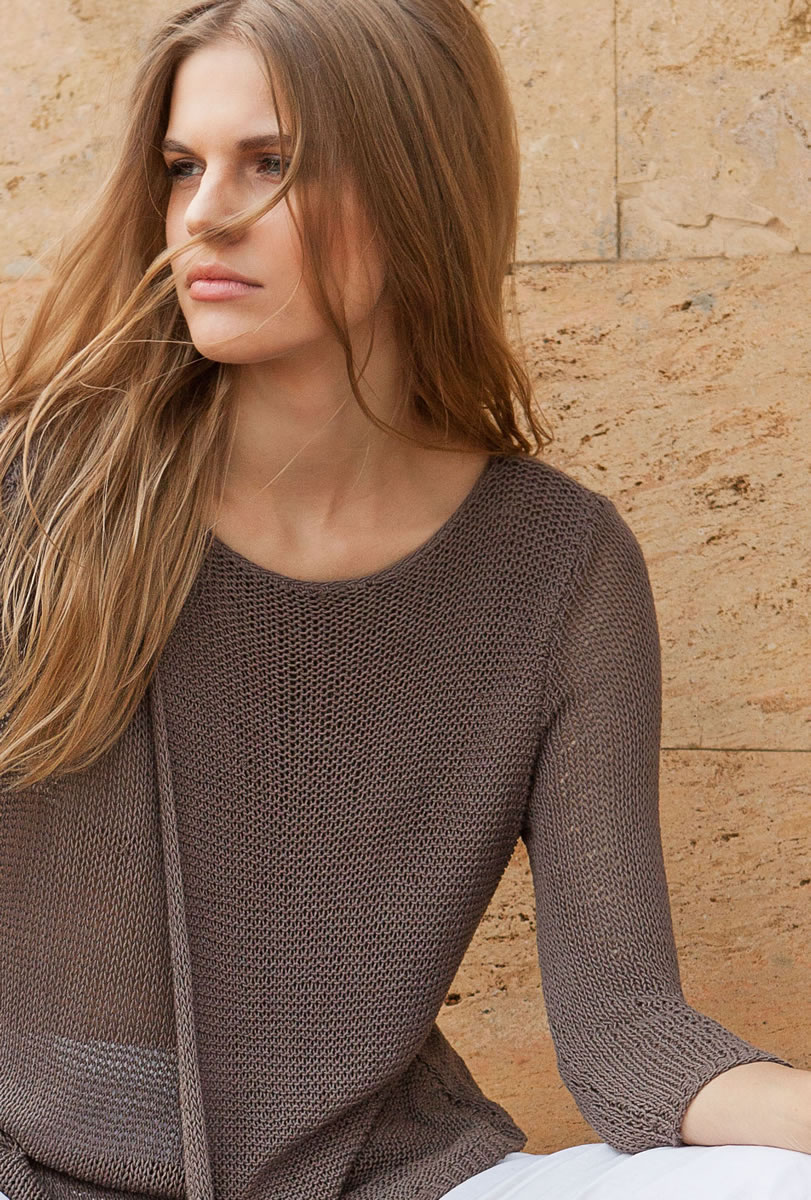350 (400) 450 г цвета ила (цв. 7) пряжи Solo Lino (80% рециклированного льна (вискозы), 20% льна, 120 м/50 г) фирмы Lana Grossa; прямые спицы № 4,5 и № 6, крючок № 5.