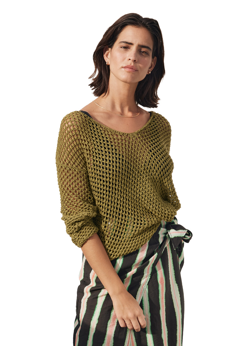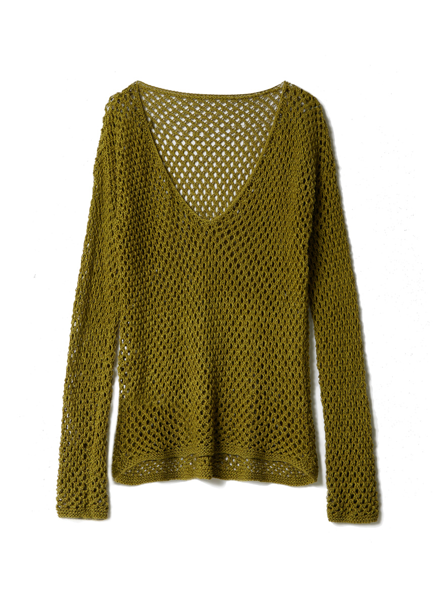 400 (450–500) г олив- ковой (цв. 51) пряжи Solo Lino (80% льна восстановленного, 20% льна, 120 м/50 г) фирмы Lana Grossa; прямые спицы № 4 и № 4,5, круговые спицы № 4 длиной 40 см и крючок № 4