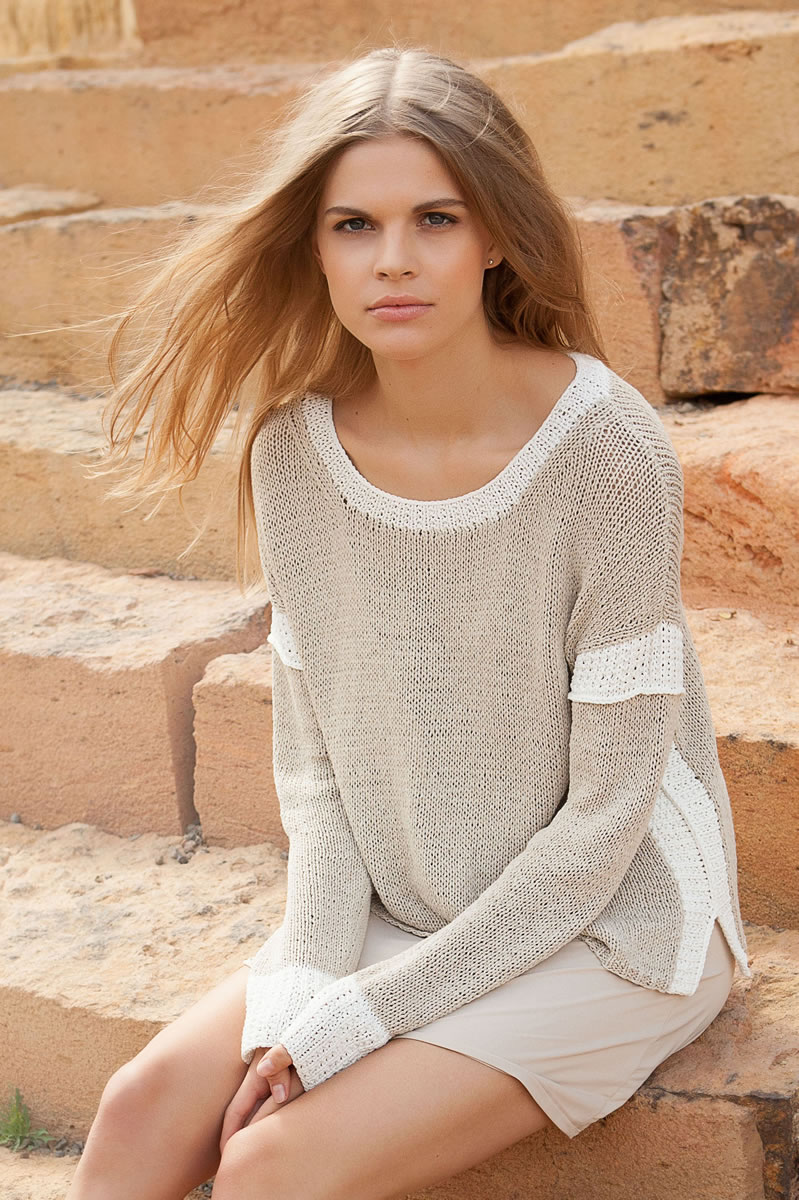 400 (450) 500 г бежевой меланжевой (цв. 103) и 100 (150) 150 г белой (цв. 101) пряжи Solo Lino Mélange (80% рециклированного льна (вискозы), 20% льна, 105 м/50 г) фирмы Lana Grossa; прямые спицы № 5, круговые спицы № 5 длиной 60 и 100 см.