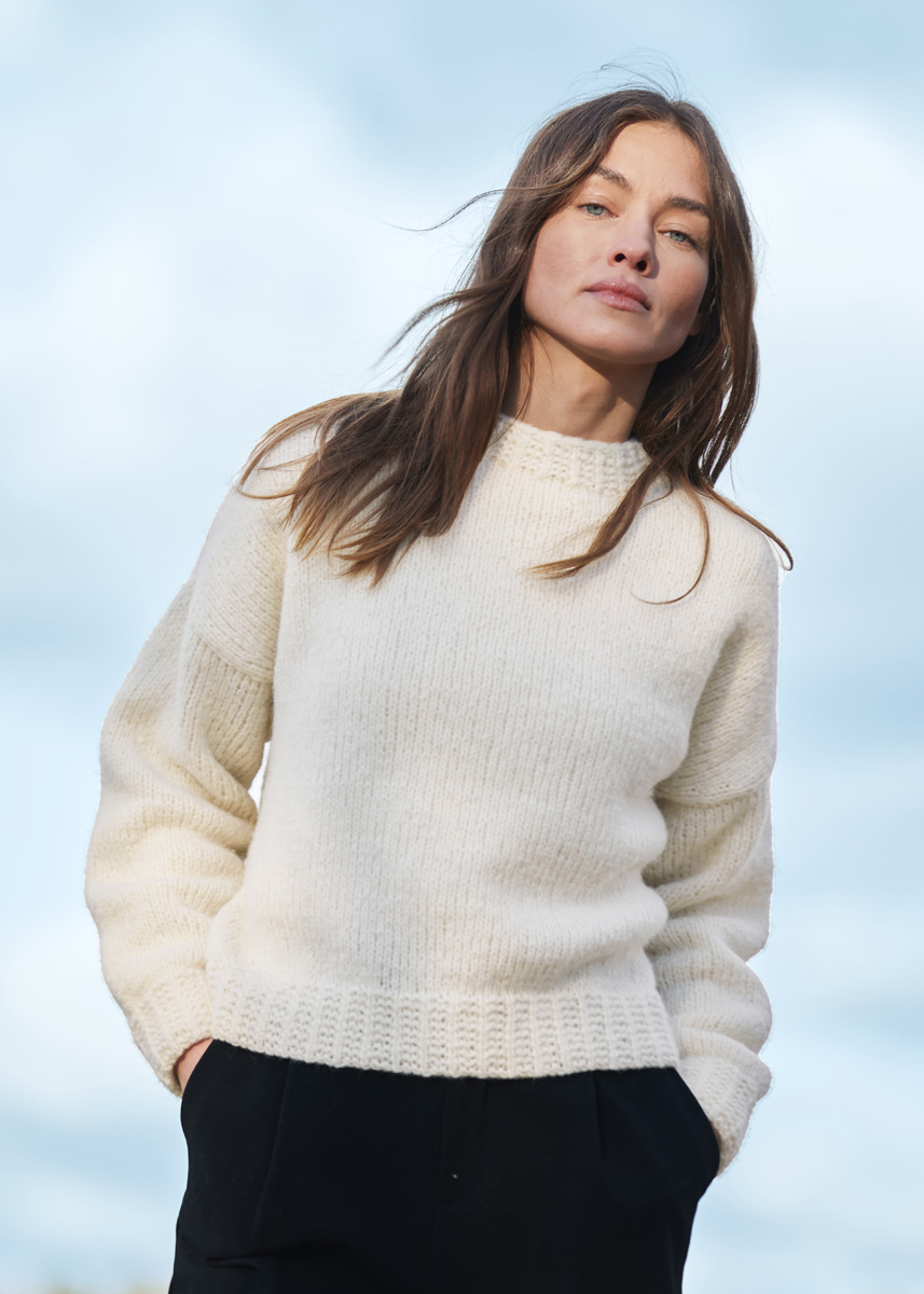 Lana Grossa-Qualität „Spuma“ (80 % шерсть (меринос), 20 % полиамид, длина нити = ca 110 m/50 g): ок 350 (400–450–450) г чисто белый (цв 1); сп. № 4,5 и 5; 1 кр. сп. № 4,5.