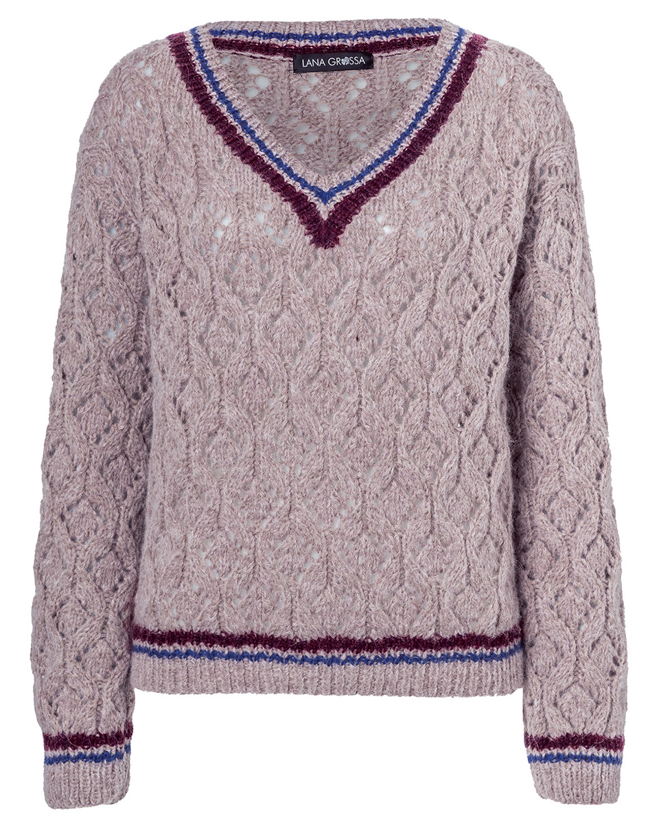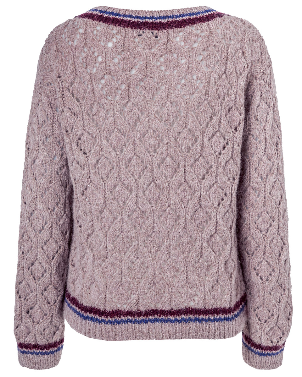 300 (350–400) г ро- зово-бежевой (цв. 41) и по 50 г черниль- но-синей (цв. 30) и цвета баклажана (цв. 34) пряжи Brigitte No. 2 (47% шерсти (яг- ненка) альпака, 45% хлопка, 8% овечьей (мериносовой) шерсти, 140 м/50 г) фирмы Lana Grossa; прямые спицы № 4 и № 6, кру- говые спицы № 4 длиной 60 см.