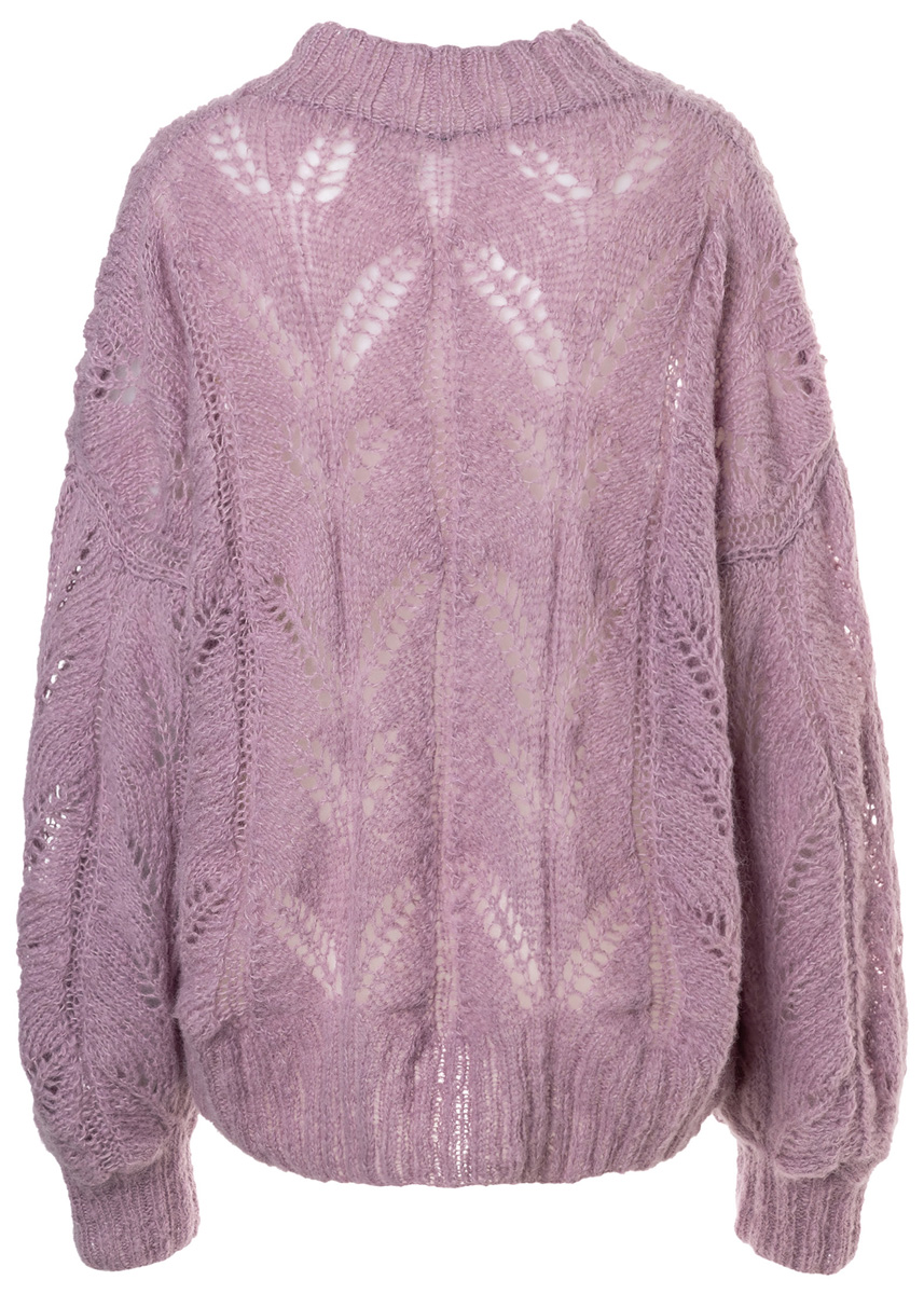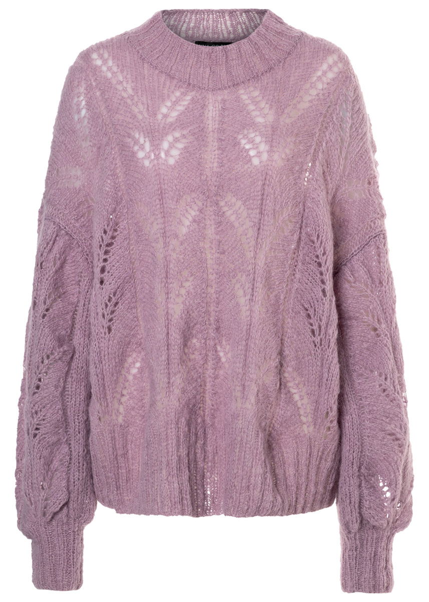 250 г сиреневой (цв. 503) пряжи Setasuri Big (70% альпака су- ри, 20% шелка, 10% шерсти мерино, 100 м/ 25 г) фирмы Lana Grossa; прямые спицы № 3,5 и № 5,5, круговые спицы № 3,5 дли- ной 40 см.