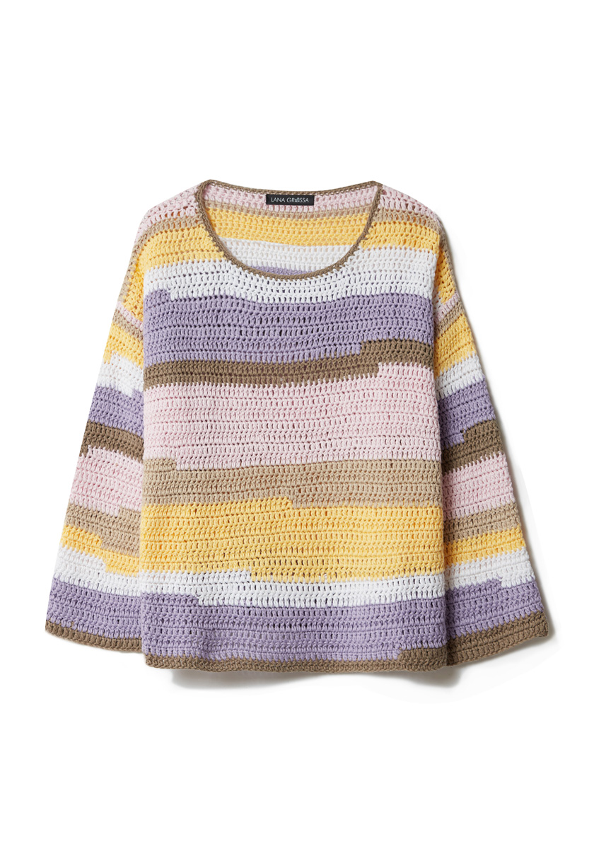 по 100 г белой (цв. 1), желтой (цв. 3), розовой (цв. 10), сирене- во-лиловой (цв. 9) и бежевой (цв. 18) и 50 (100–100) г розовато-коричневой (цв. 17) пряжи Dodici (65% хлопка, 25% вискозы, 10% льна, 110 м/50 г) фирмы Lana Grossa; крючок № 4,5.