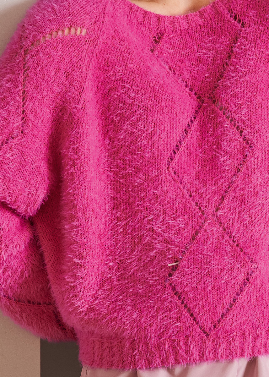350 (400) г ярко-розо- вой (цв. 3) пряжи Per Fortuna (74% (био) хлопка, 26% рециклированного полиамида, 190 м/50 г) фирмы Lana Grossa; прямые спицы № 3 и № 4,5, круговые спицы № 3 длиной 40 см