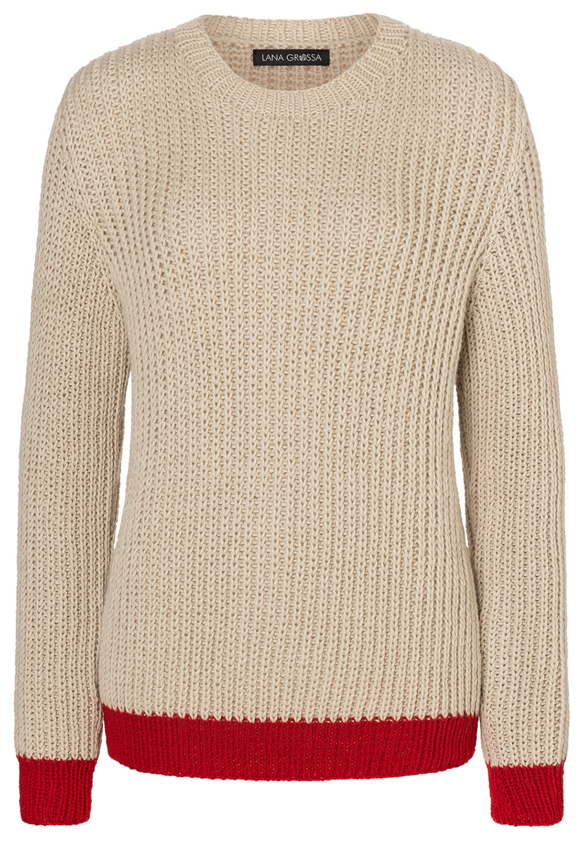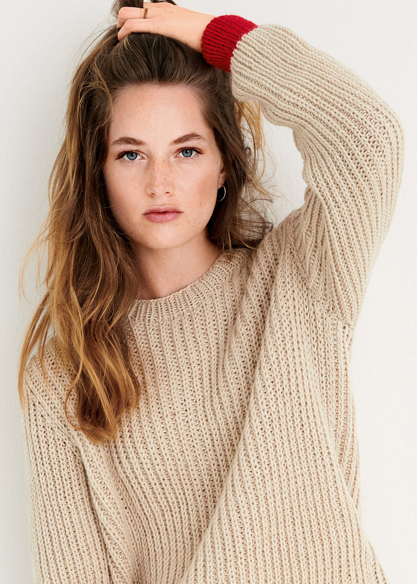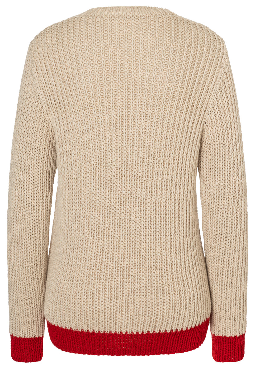 550 (600–650–700) г светло-бежевой (цв. 302) и 100 (100–150– 150) г красной (цв. 319) пряжи Landlust Alpaca Merino 100 (50% овечьей (мерино- совой) шерсти, 50% шерсти (ягненка) альпа- ка, 100 м/50 г) фирмы Lana Grossa; прямые спицы № 4,5 и № 5,5, круговые спицы № 4,5 длиной 50 см