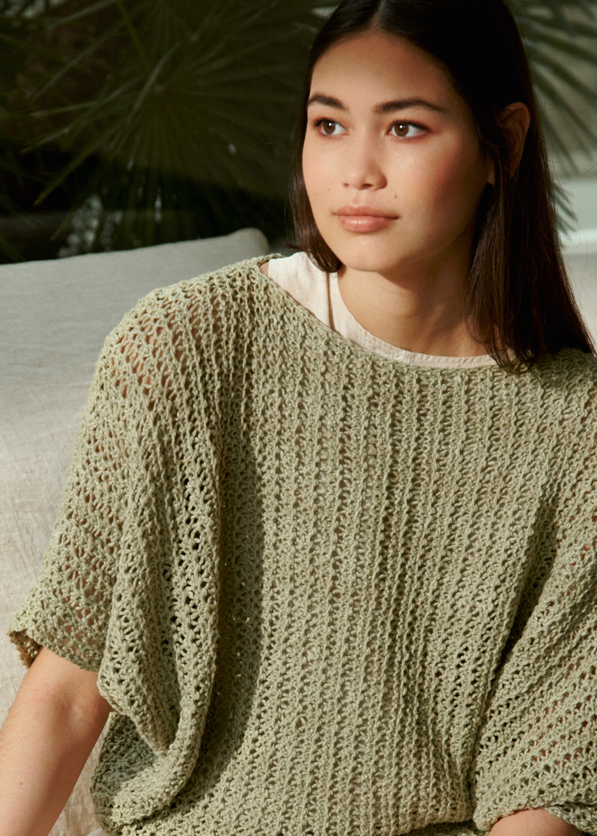 350 (400–450) г цве- та хаки (цв. 4) пряжи Bacca (100% хлопка, 120 м/50 г) фирмы Lana Grossa; круговые спицы № 4 длиной 100 см, крючок № 3,5
