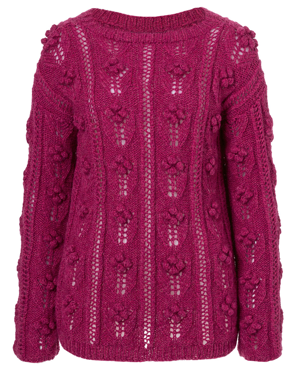 400 (450–500) г цвета фуксии (цв. 38) пряжи Brigitte No. 2 (47% шерсти (ягненка) альпака, 45% хлопка, 8% овечьей (мериносовой) шерсти, 140 м/50 г) фирмы Lana Grossa; прямые спицы № 4 и № 4,5, круговые спицы № 4 длиной 50 см, 1 игла с тупым концом (= игла для выши- вания).