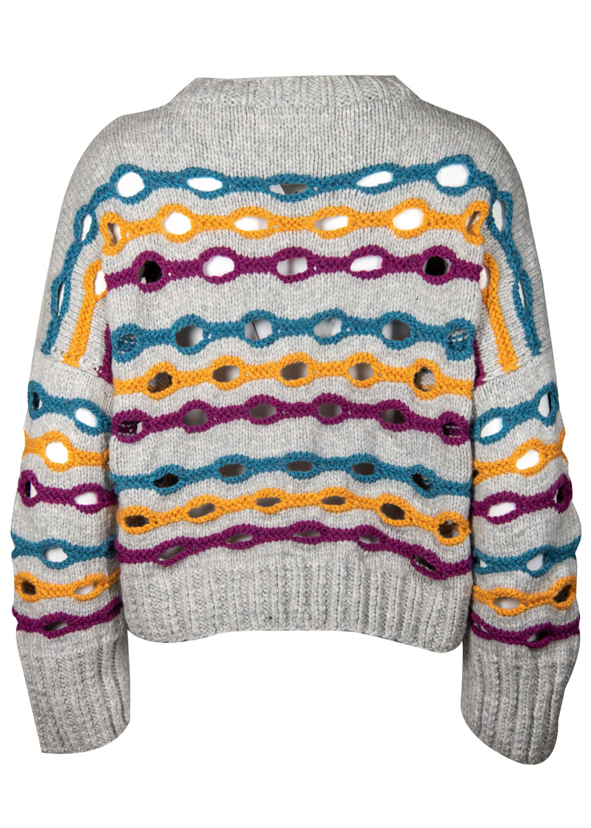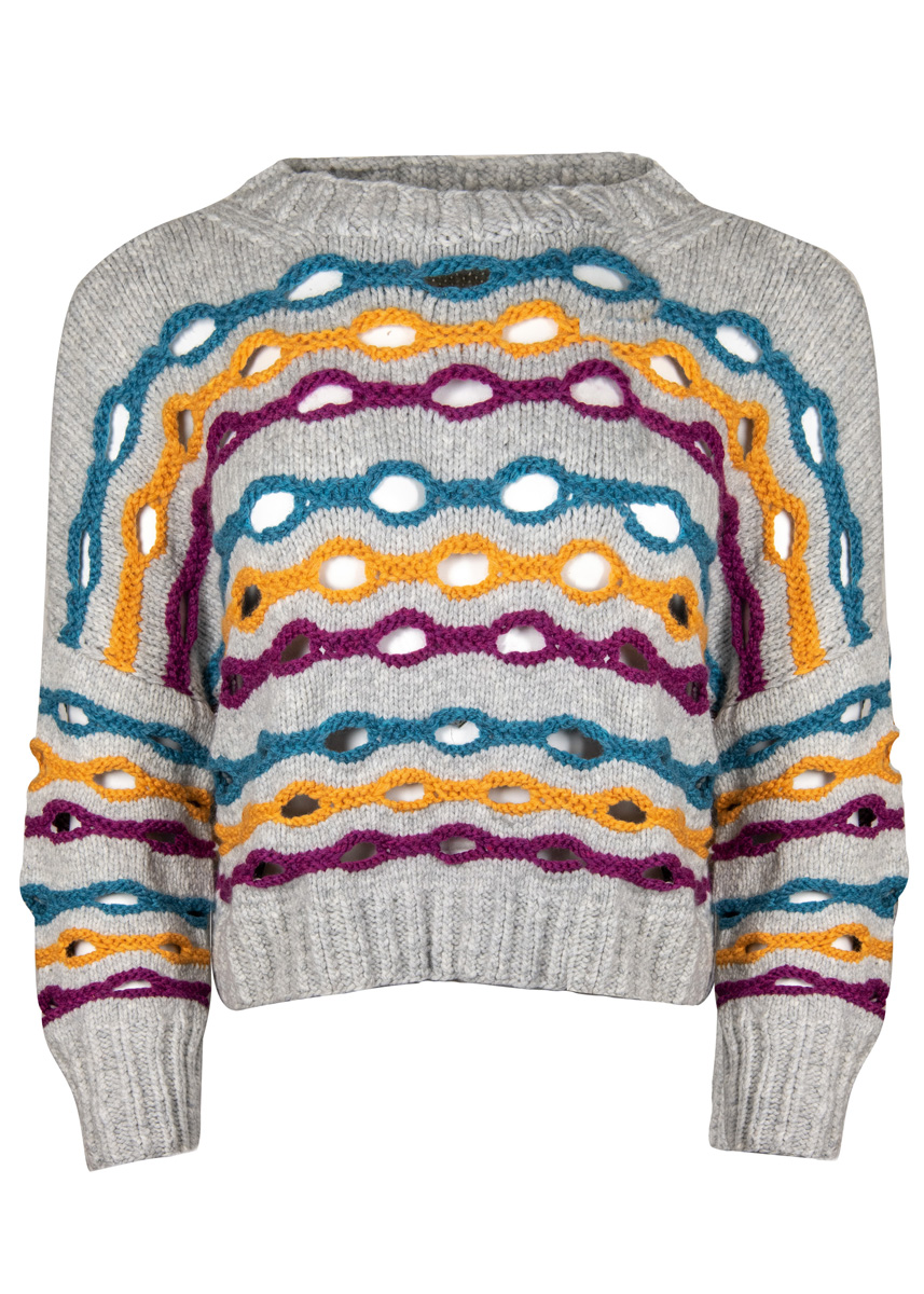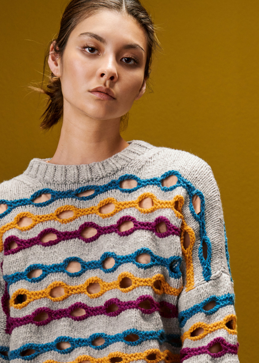 400 (450) г светло-серой меланжевой (цв. 1), 100 г цвета айвы (цв. 28), по 50 г красно-фиолетовой (цв. 38) и петрольной (цв. 9) пряжи Alta Moda Cashmere 16 (78% овечьей (мериносовой) шерсти, 12% кашемира, 10% полиамида, 110 м/50 г) фирмы Lana Grossa; прямые спицы № 6 и № 7, круговые спицы № 6 длиной 50 см