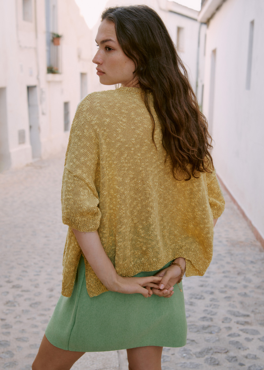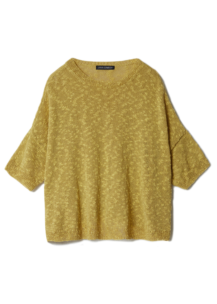 Lana Grossa-Qualität „Terra” (58 % лён, 42 % хлопок, длина нити = ок. 170 m/50 g): ок. 350 г горчично- желтый (цв. 15); сп. № 3 и 3,5, 1 кр. сп. № 3, 50 см.