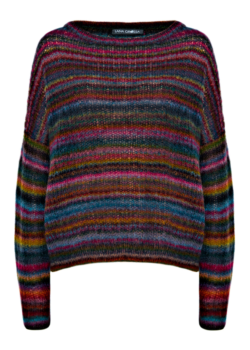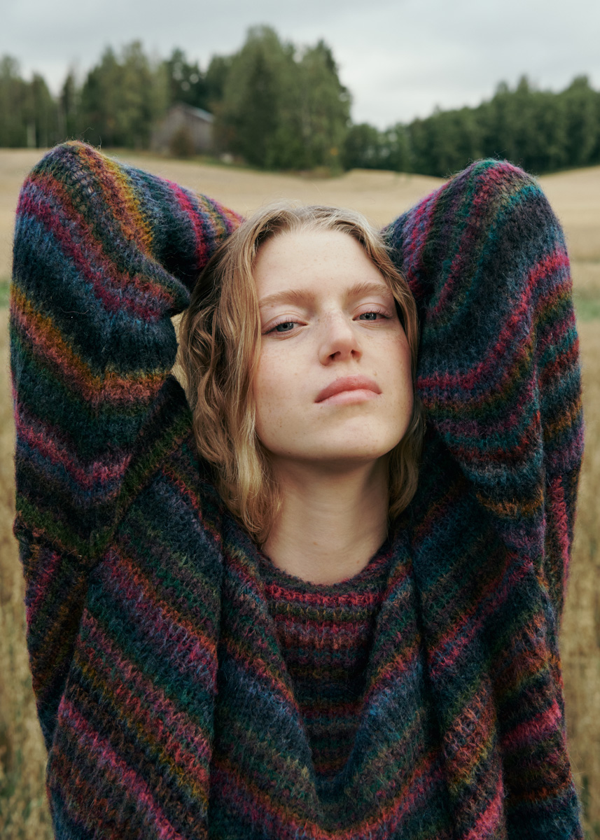 Lana Grossa-Qualität „Twin 25 g“ (37 % беби альпака, 37 % шерсть (меринос), 26 % полиамид, длина нити 200 m/25 g): ок. 175 (200–225) г пинк/ежевика/ оливковый/петроль/серо-фиолетовый (цв. 101); сп. № 3,5 и 4, 1 кр. сп. № 3,5, 50 см длиной