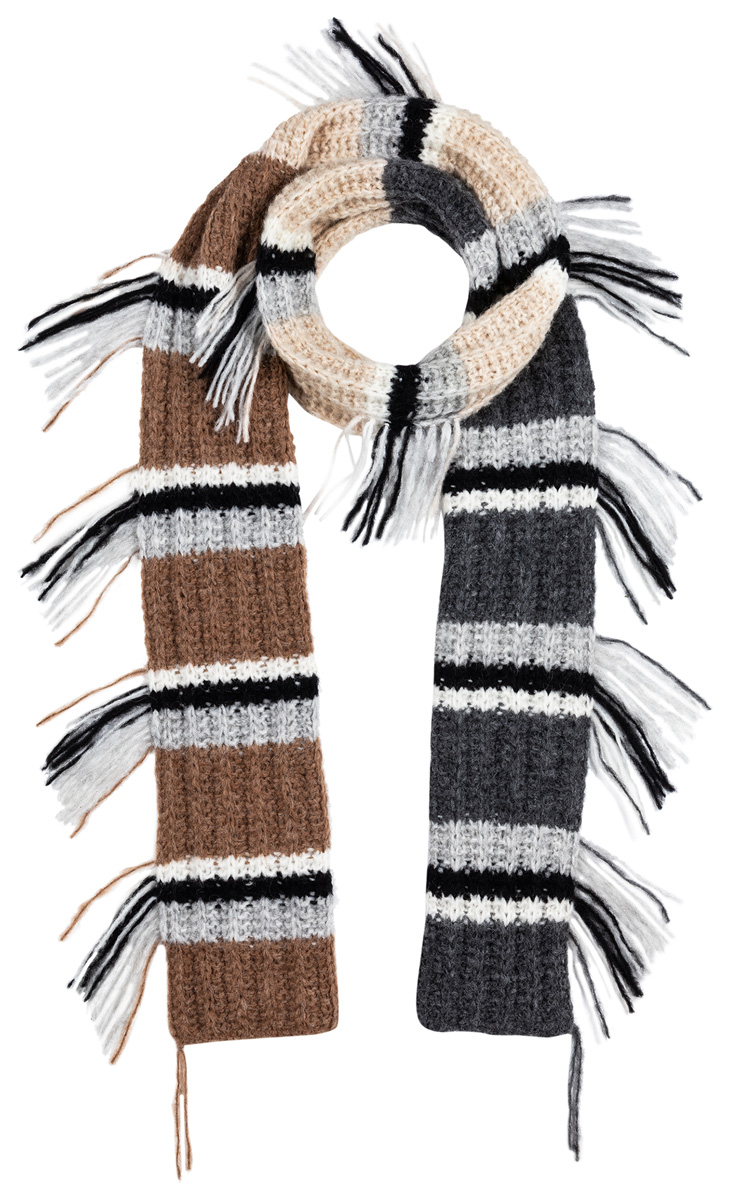 Lana Grossa Alpaca Moda (74% альпака (беби), 13% шерсть, 13% полиамид, длина нити 135 m/50 g), 50 г бежевый (цв 2), 50 г светло серый (цв 4), 50 г легко коричневый (цв 3), 50 г антрацитовый (цв 5), 50 г белый (цв 1) и 50 г чёрный (цв 16); сп. № 8