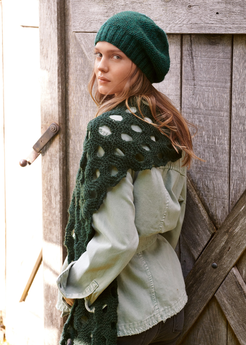 Lana Grossa „Baby Light“ (62% альпака (беби), 23% шерсть (меринос), 15% полиамид; длина нити 180 m/50 g), 200 г темно зеленый (цв 8); сп. № 7.