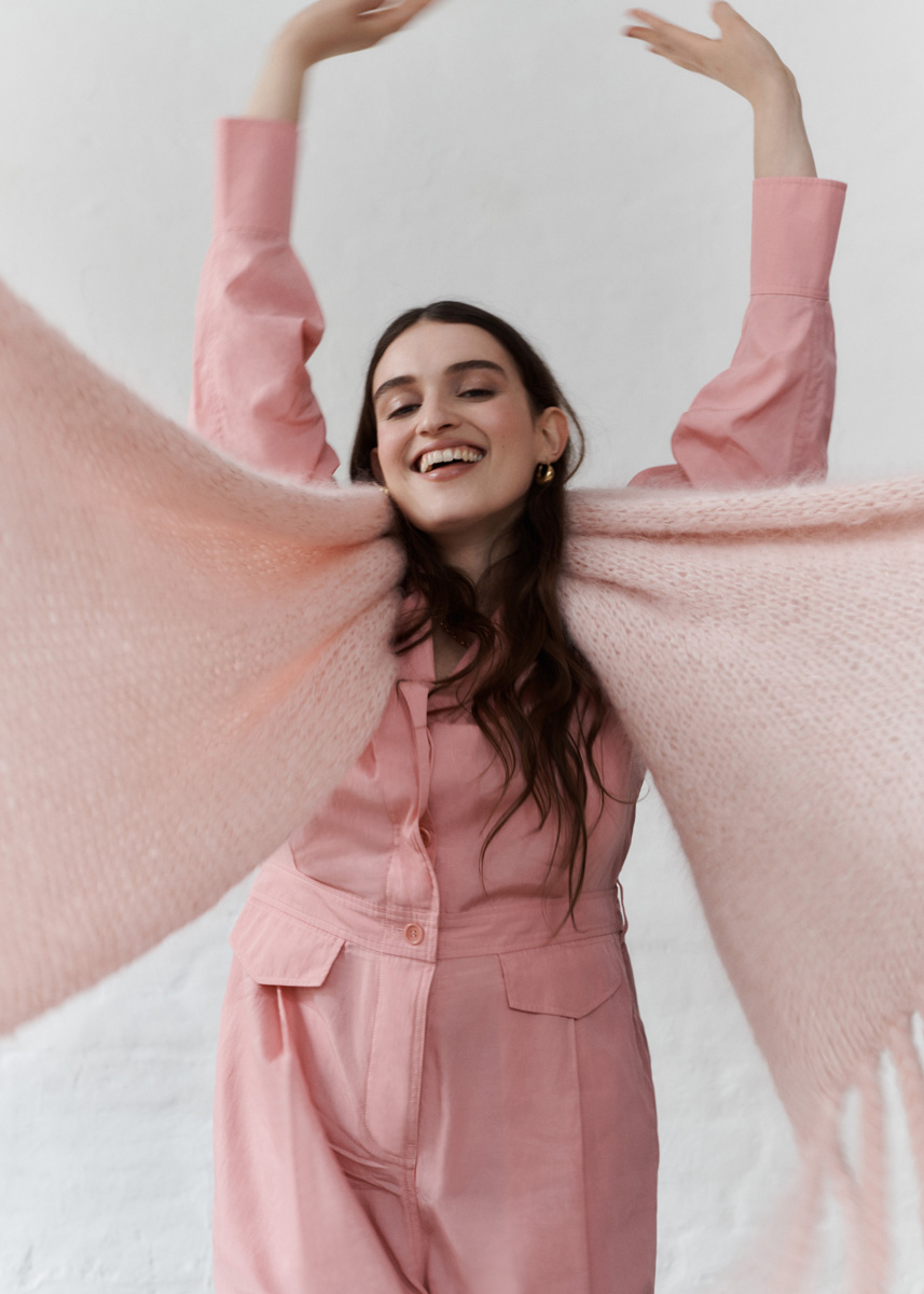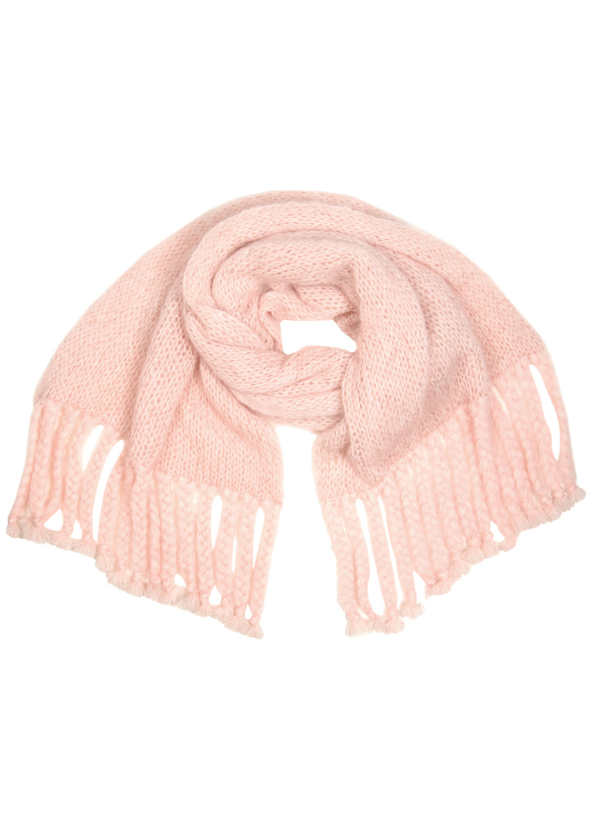 Lana Grossa „Brigitte No. 3“ (40% мохер, 37% меринос, 23% полиамид; длина нитки 100 m/25 g), 450 г мягко-розовый (цв 8); Lana Grossa „Diamante“ (100% полиэстер; длина нитки 195 m/25 g), 100 г розовый (цв 2); кр. сп. № 9, длиной 60 см