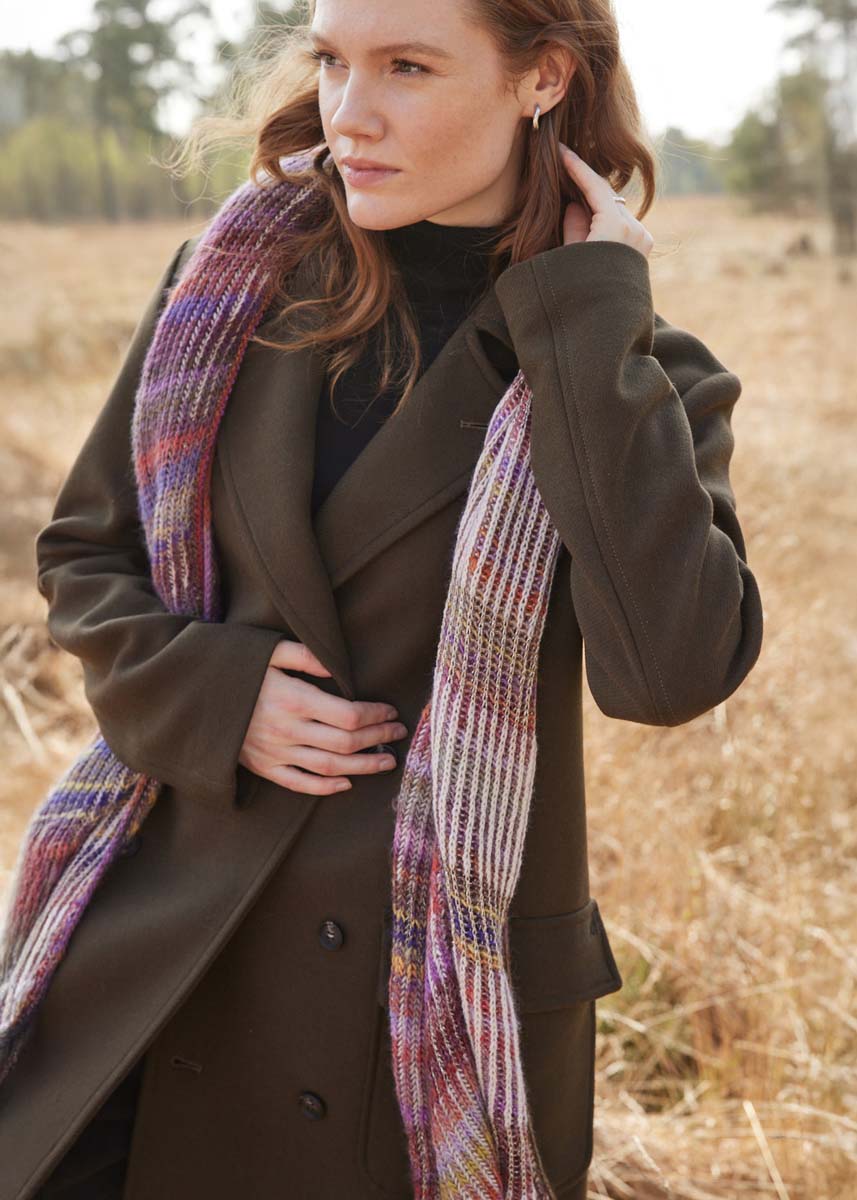 Lana Grossa Colorissimo (100% шерсть (меринос), длина нити 300 m/100 g), 200 г коричного -оранжевый/красно-коричневый/золотисто-каштановый/ сиреневый/баклажановый/серо-зеленый/оливковый (цв. 214), Lana Grossa Ecopuno (72% хлопок, 17% шерсть (меринос), 11% альпака (беби), длина нити 215 m/50 g), 100 г бежевый жемчуг (цв. 66) и Lana Grossa Brillino (83% вискоза, 17% металл. волокно, длина нити 200 m/25 g), 25 г серо-бежевый/серебряный (цв. 39); 1 кр. сп. № 4,5, 1 чул. сп. № 4,5.