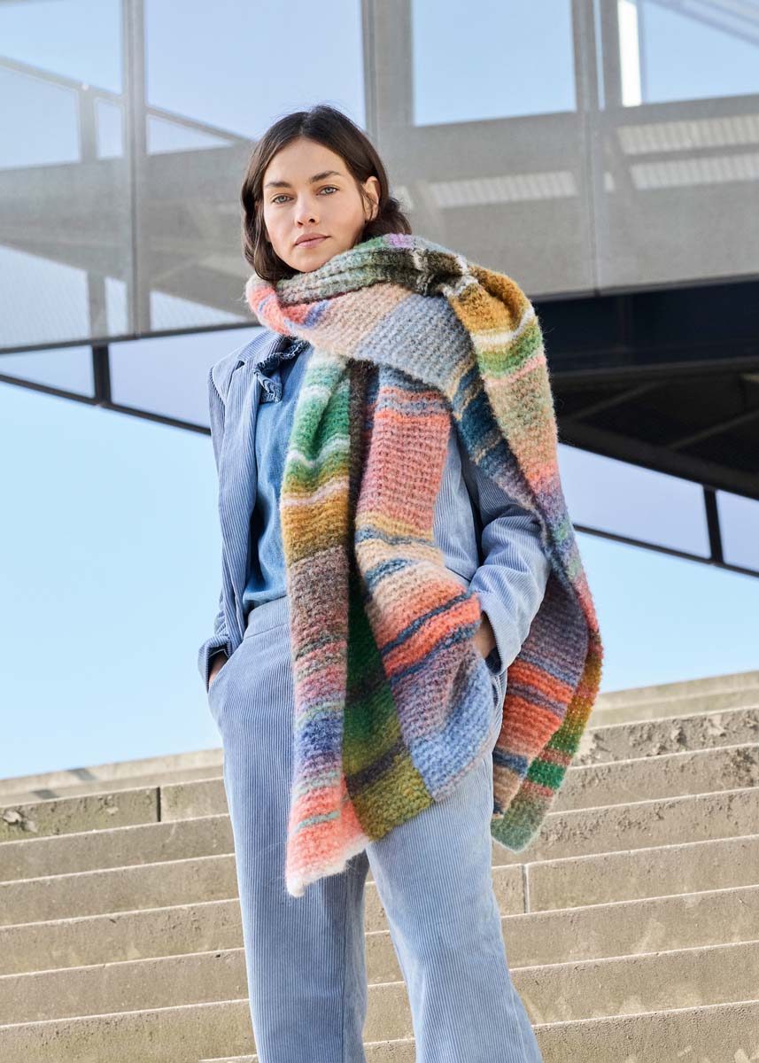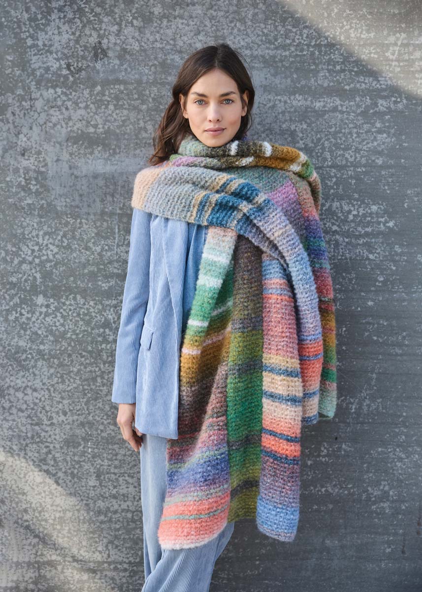 Lana Grossa-Qualität „Gigante Multi“ (70 % альпака (файн), 30 % полиамид, длина нити = ca 150 m/50 g): ок 100 г серо-синий/бежевый/серо-красный/ мандариновый/петроль зелёный/серо- желтый (цв 101), ок 100 г серо-зеленый/красная фиалка/темно джинсовый/жёлто-оранжевый/красная герания/ оливковый/мох зеленый (цв 105) и 100 г тёмно-оливковый/ светло-оливковый/ розовый/ серо-зеленый/ зелёный/ ежевика/старо-фиолетовый (цв 106); сп. № 6,5