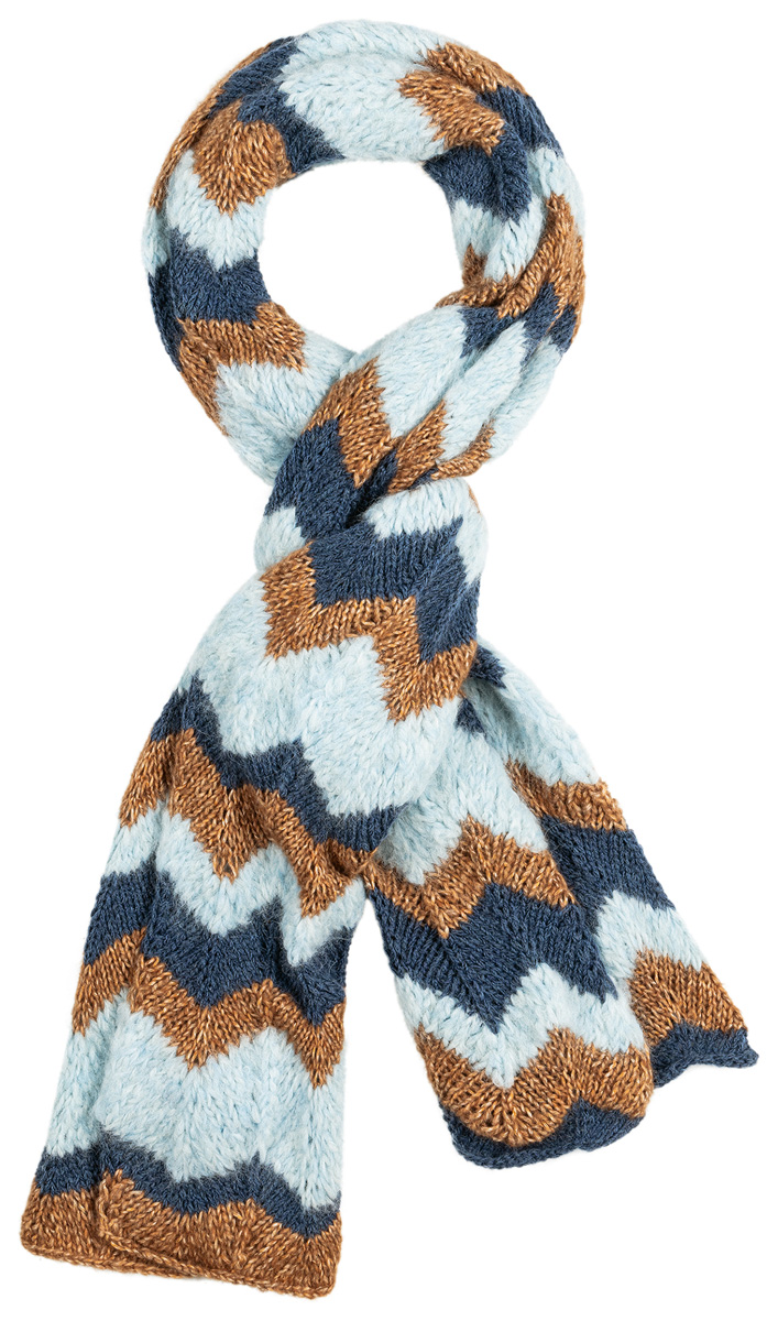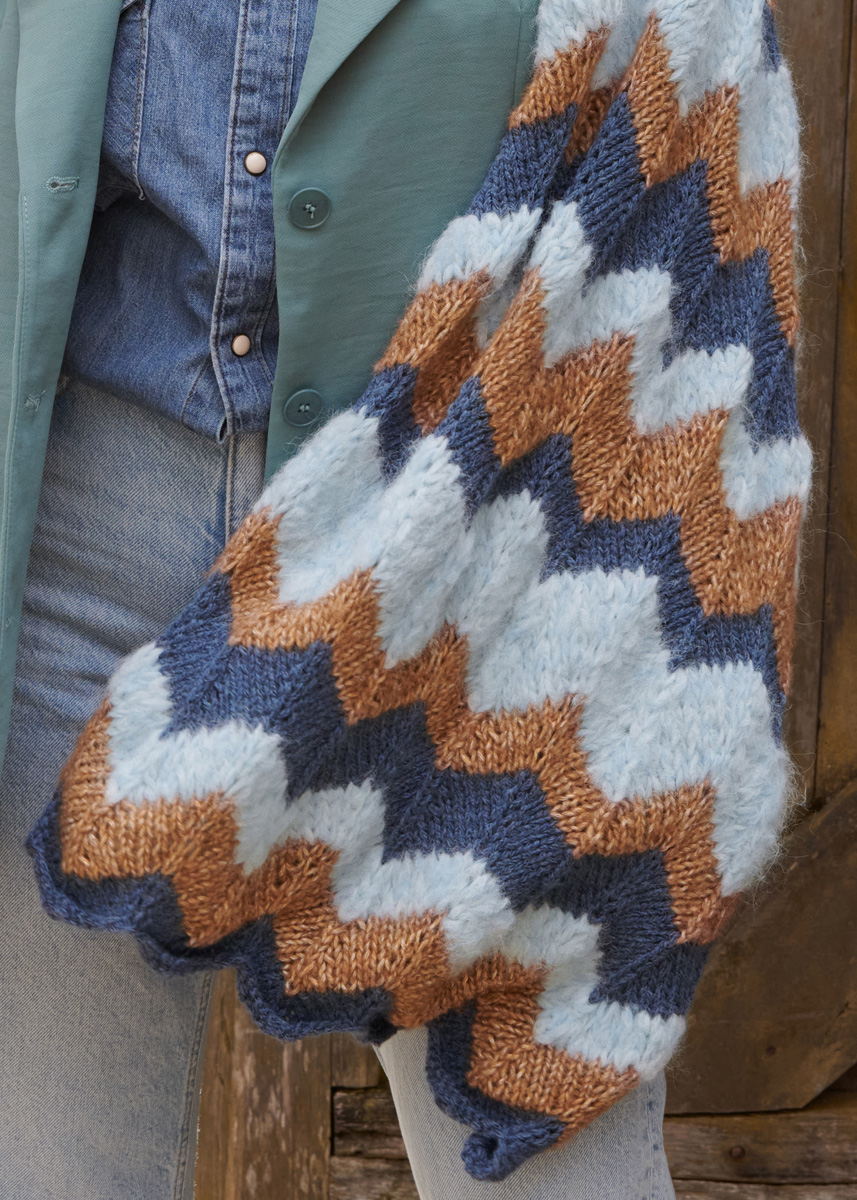 Lana Grossa Lala Berlin Furry (90% альпака (беби), 10% полиамид, длина нити 75 m/50 g), 250 г бело синий (цв 21), Lana Grossa Sara (65% хлопок, 30% альпака (беби), 5% шерсть (меринос), длина нити 125 m/50 g), 100 г легко коричневый меланжевый (цв 18) и Lana Grossa Alta Moda Alpaca (90% альпака (беби), 5% шерсть (меринос), 5% полиамид, длина нити 140 m/50 g), 150 г серо-синий меланжевый (цв 60); 1 кр. сп. № 8, 60 см