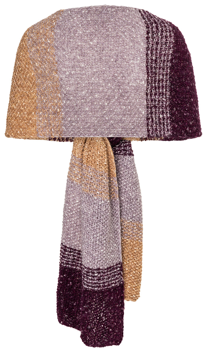 Lana Grossa Brigitte No. 2 Seta (38% альпака (беби), 33% полиакрил, 25% шерсть (меринос), 4% шёлк, длина нити 175 m/50 g), 100 г сирень меланжевый (цв 4), 100 г легко коричневый меланжевый (цв 8) и 100 г баклажановый меланжевый (цв 10); 1 кр. сп. № 6,5.