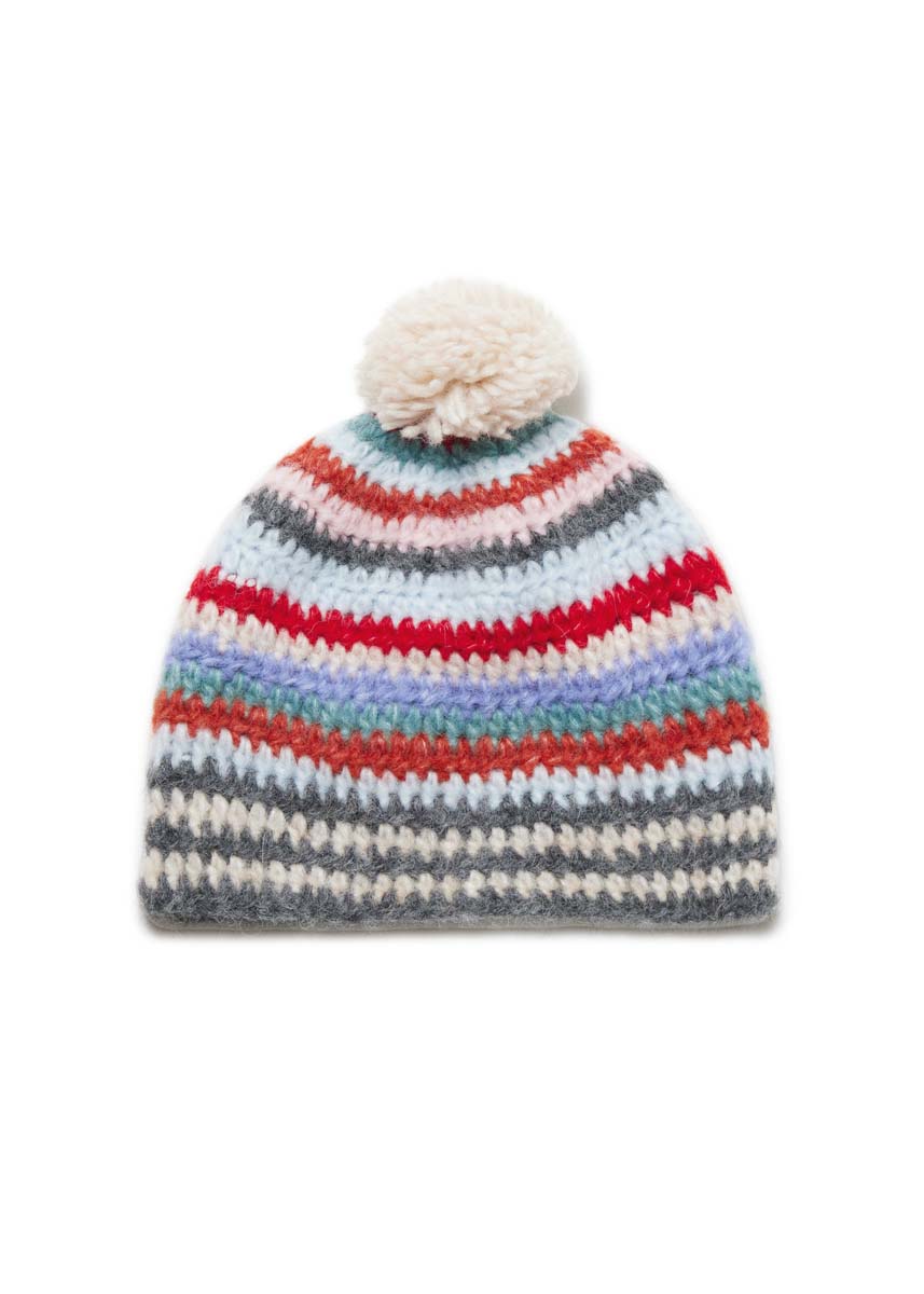 по 50 г бежевой (цв. 2) и цвета антрацита (цв. 11), лиловой (цв. 5), красной (цв. 9), розовой (цв. 4), цвета морской волны светлой (цв. 23), пастельно-синей (цв. 28) и ржаво-красной (цв. 19) пряжи Alpaca Air (62% альпака бэби, 27% полиамида, 11% шерсти мерино экстрафайн, 140 м/50 г) фирмы Lana Grossa; крючок № 5 и № 6; набор для изготовления помпонов диаметром 8,5 см