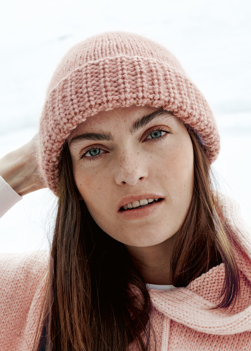 100 г нежно-розовой (цв. 39) пряжи Alta Moda Cashmere 16 (78% шерсти мерино 16 микрон, 12% кашемира, 10% полиамида, 110 м/50 г) и 25 г цве- та розового дерева (цв. 74) пряжи Silkhair (70% мохера суперкид, 30% шелка, 210 м/25 г) фирмы Lana Grossa; чу- лочные спицы № 5.