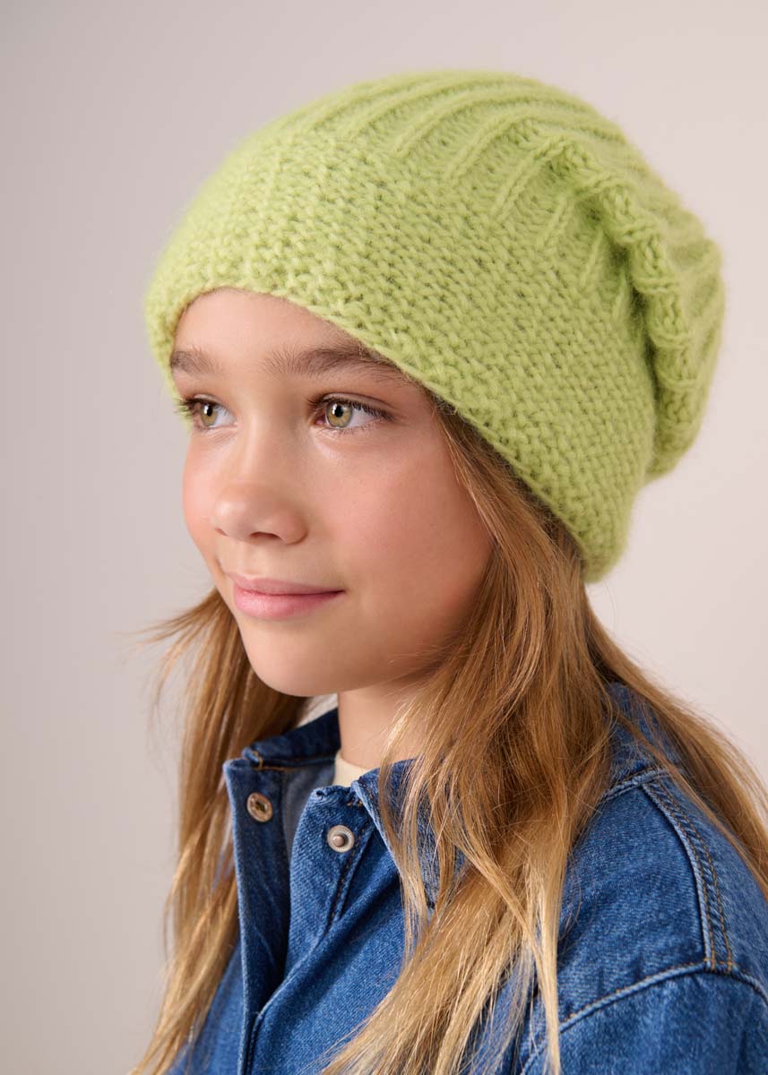 50 г нежно-зеленой (цв. 58) пряжи Brigitte No. 2 (47% альпа- ка бэби, 45% хлопка, 8% шерсти мери- но, 140 м/50 г) фирмы Lana Grossa; короткие круговые или чулочные спицы № 4,5; маркеры для петель