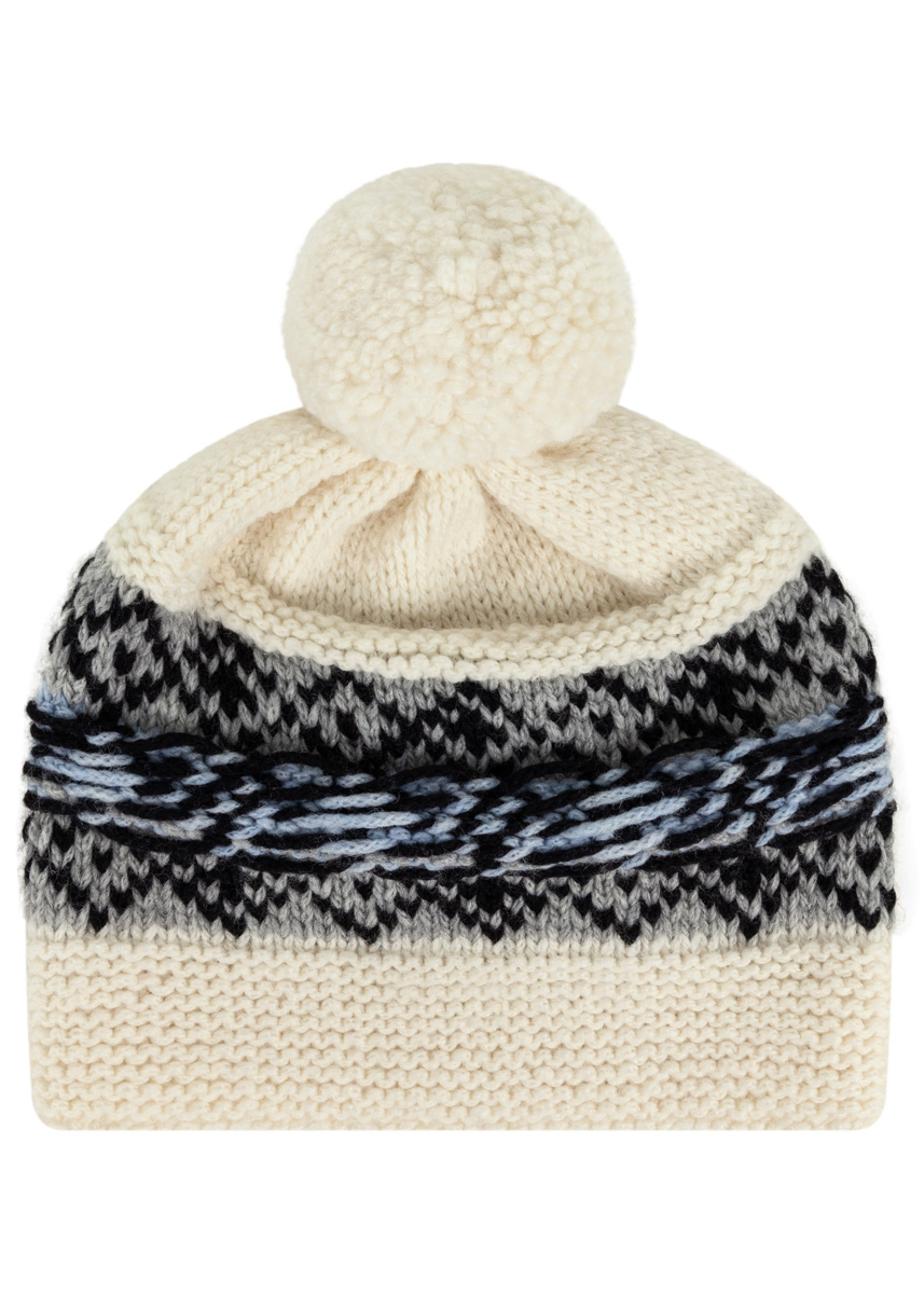50 г белой (цв. 15), 50 г светло-синей (цв. 6), 50 г светло-серой (цв. 13) и 50 г черной (цв. 14) пряжи Cool Merino (90% шерсти мерино экстрафайн, 10% полиамида, 150 м/50 г) фирмы Lana Grossa; чулочные спицы № 5,5 и № 6, набор для изготовления помпонов диаметром 8,5 см