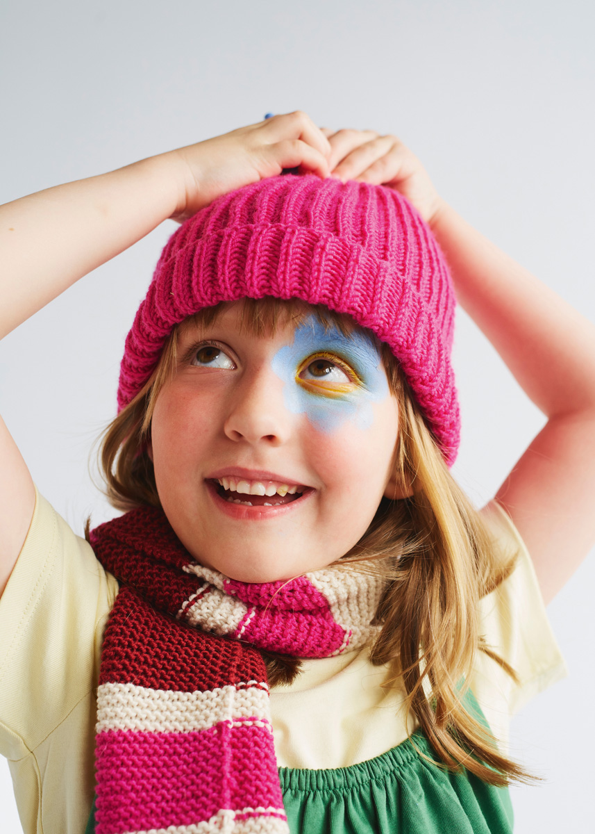 100 г цвета цикламена (цв. 537) или зеленой (цв. 2017) пряжи Cool Wool (100% шерсти, 160 м/50 г) фир- мы Lana Grossa; чулочные спицы № 3,5