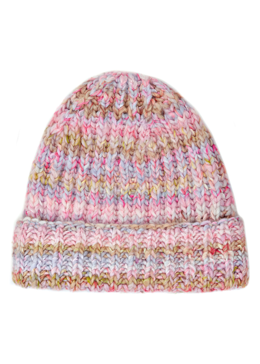 Lana Grossa-Qualität „Lala Berlin Stripy“ (56 % шерсть (меринос), 29 % полиакрил, 14 % беби альпака, 1 % эластан, длина нити 90 m/50 g): ок. 100 г розовый/ пастельно-зелёный/бежевый/ натуральный/ сирень/ светло-серый (цв. 10); чул. сп. № 8, 1 кр. сп. № 8, 50 см длиной, 1 игла от Lana Grossa