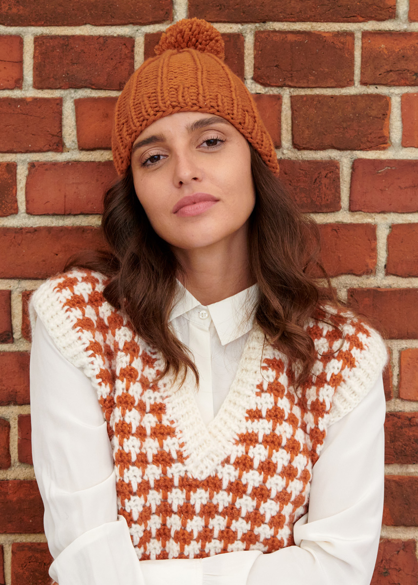 Lana Grossa Mille II (50% шерсть (меринос), 50% полиакрил, длина нити 55 m/50 g), 100 г карамель (цв 143); 1 кр. сп. №. 7, 40 см и 1 чул. сп. № 7 и 1 набор для помпонов Lana Grossa, Ø 8,5 см
