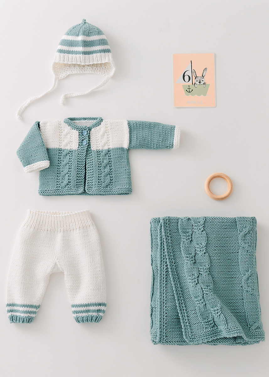 50 г белой (цв. 1) и 50 г цвета мяты (цв. 6) пряжи Riserva (70% хлопка, 30% полиамида, 125 м/50 г) фирмы Lana Grossa; чулочные спицы № 4, крючок № 3,5