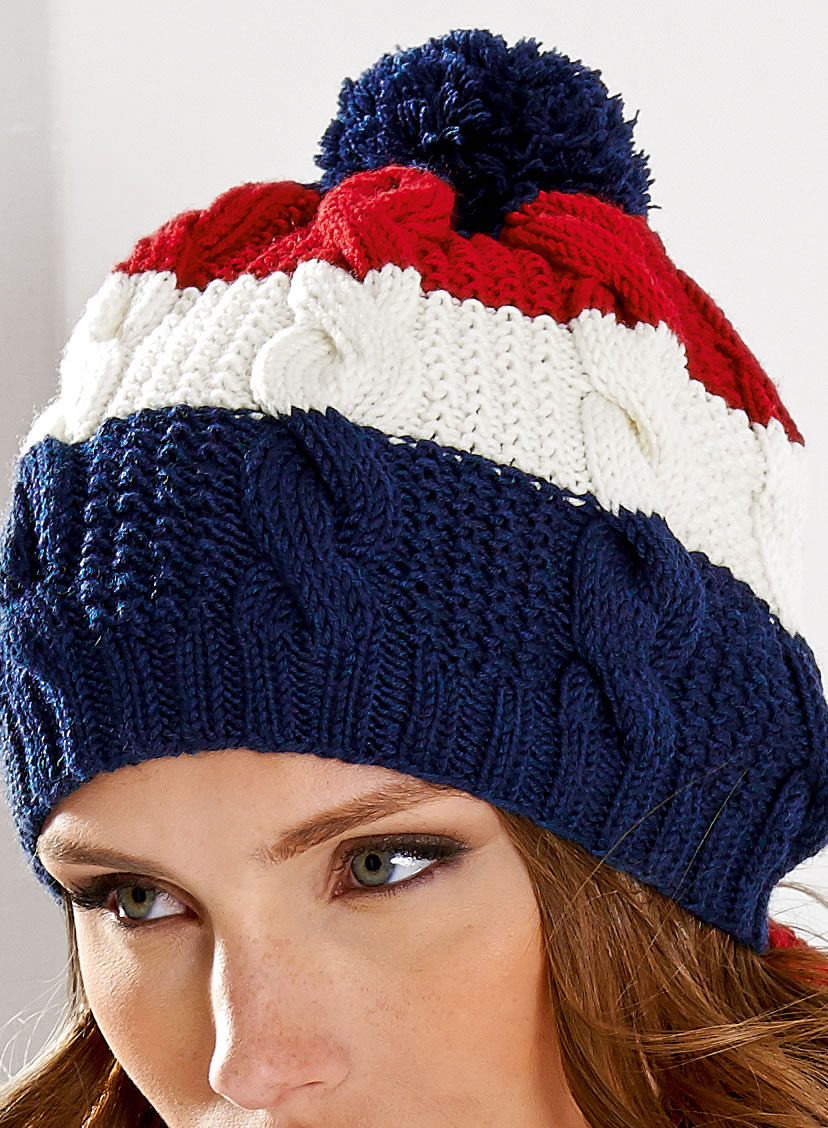 50 г синей меланжевой (цвет 314) пряжи Cool Wool Big Melange фирмы Lana Grossa (100% шерсти мерино экстрафайн, устойчивой к сваливанию, 120 м/50 г), по 50 г белой (цвет 601) и темно-красной (цвет 924) пряжи Cool Wool Big фирмы Lana Grossa (100% шерсти мерино экстрафайн, устойчивой к сваливанию, 120 м/50 г); набор чулочных спиц № 3,5 и 4, круговые спицы № 4 длиной 60 см.