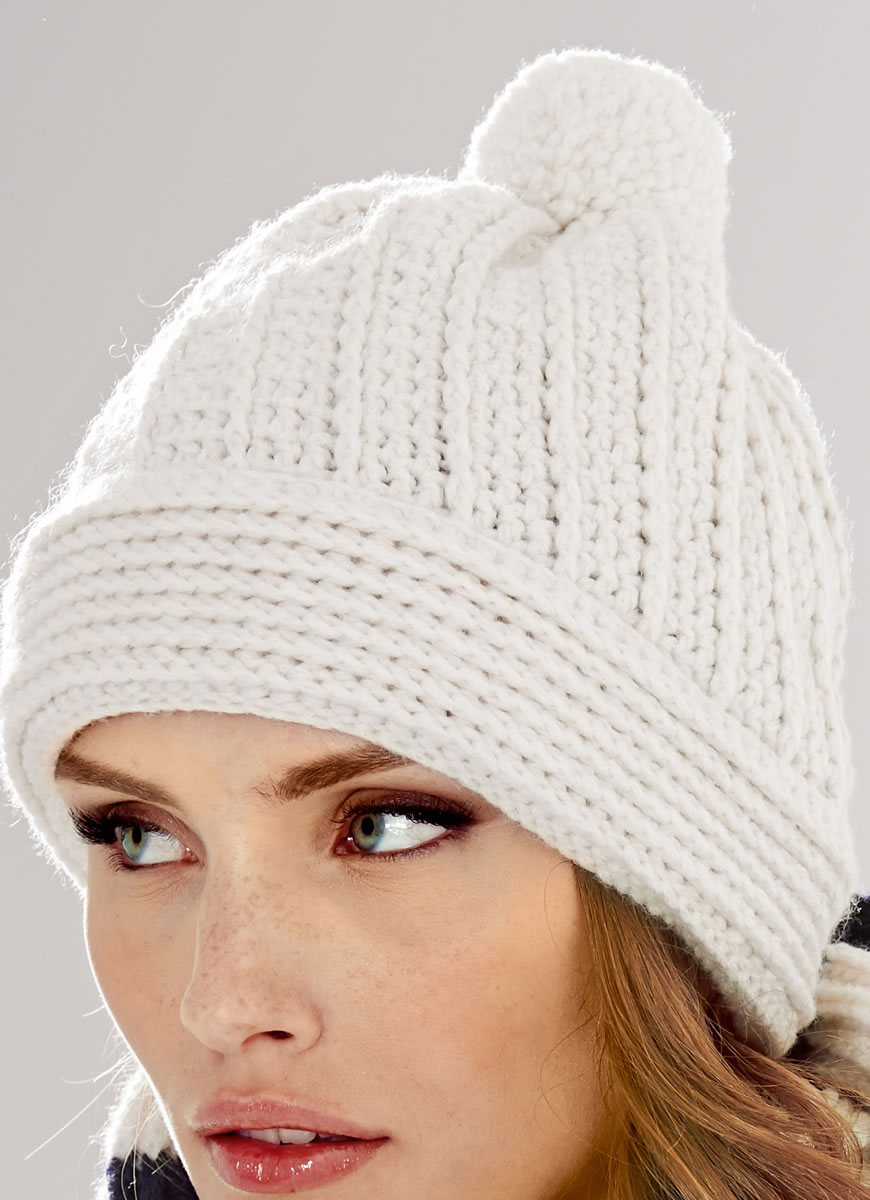 Холод стилю не помеха! Белоснежная шапка и черно-белый шарф в полоску не позволят зиме украсть у Вас модные образы! (Обхват головы 54–56 см, высота шапки с отворотом 22 см, обхват шапки 51 см)