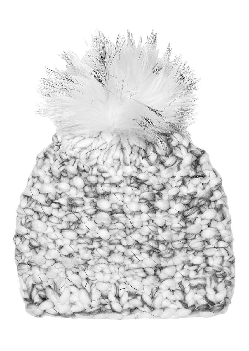 Lana Grossa-Qualität „Weekend Color” (69 % шерсть (меринос), 30 % альпака, 1 % хлопок, длина нитки = ок. 35 м/100 г): ок. 100 г чисто-белый/оливковый/серо-коричневый (цв. 105); спицы № 15; 1 помпон „Finnraccoon Natur“ (100 % Finnraccoon) von Lana Grossa с кнопкой, арт. 9779906, цв. 115 поляр