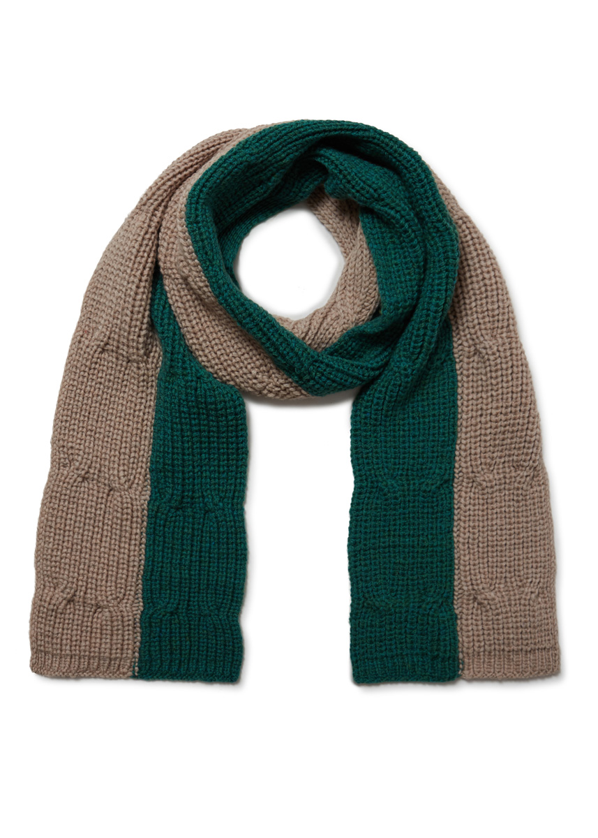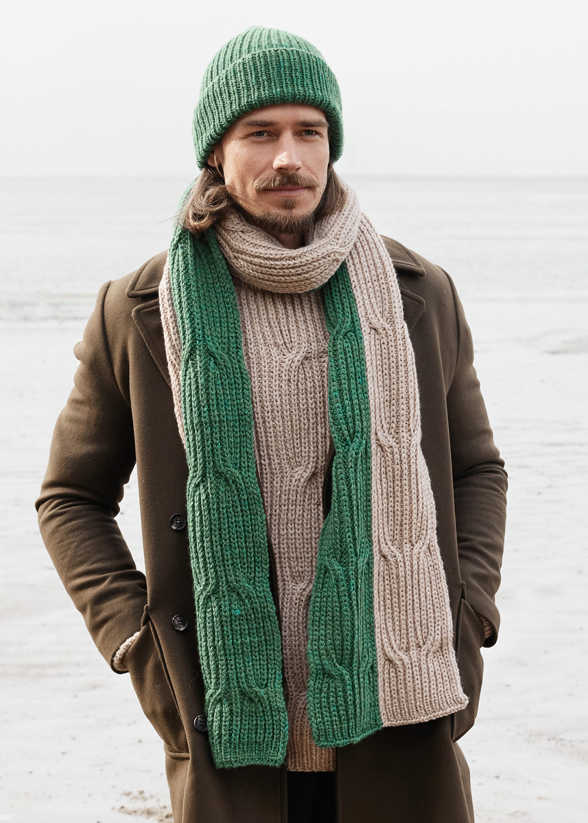 200 г цвета зеленого опала (цв. 77) и 200 г бежевой (цв. 76) пряжи Alta Moda Cashmere 16 (78% шерсти мерино 16 микрон, 12% кашемира, 10% полиамида, 110 м/50 г) фирмы Lana Grossa; прямые спицы № 6 и 2 вспомогательные спицы для кос