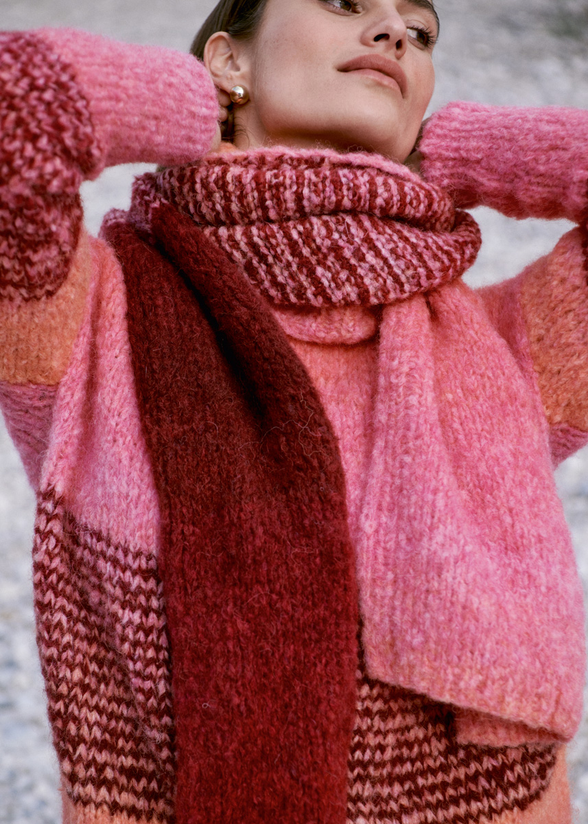 по 100 г восточно-/темно-красной (цв. 14) и малиновой/абрикосовой (цв. 12) пряжи Avio (63% альпака суперфайн, 37% полиамида, 150 м/50 г) фирмы Lana Grossa; круговые спицы № 7