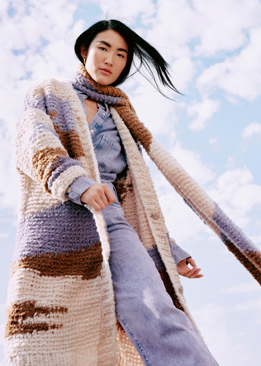100 г бежевой (цв. 1), 100 г цвета нуги (цв. 2) и 100 г серо-лиловой (цв. 5) пряжи Lala Berlin Cloudy (93% шерсти мерино экстрафайн, 7% полиамида, 100 м/50 г) фирмы Lana Grossa; прямые спицы № 8.
