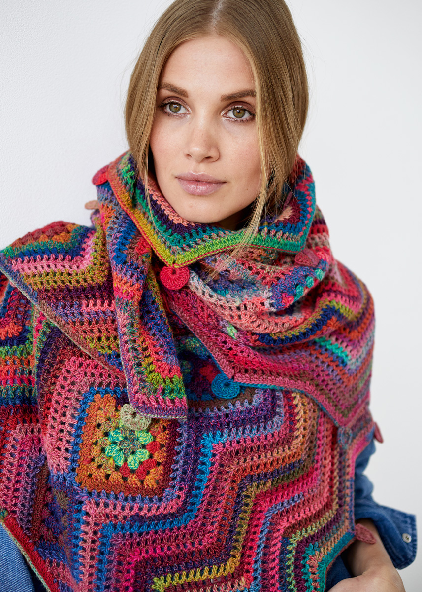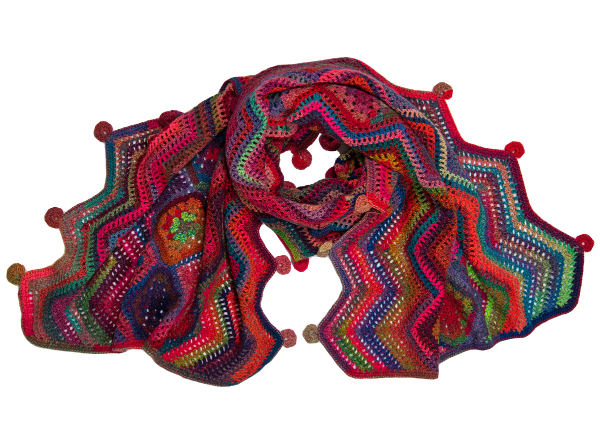 500 г цвета ржавчины/ петрольной/желто-розовой/зеленой/крас- ной/ винно-красной/малиновой (цв. 7) пряжи Colorissimo (100% мериносовой шерсти экстрафайн, 300 м/100 г) фирмы Lana Grossa; крючок № 4,5