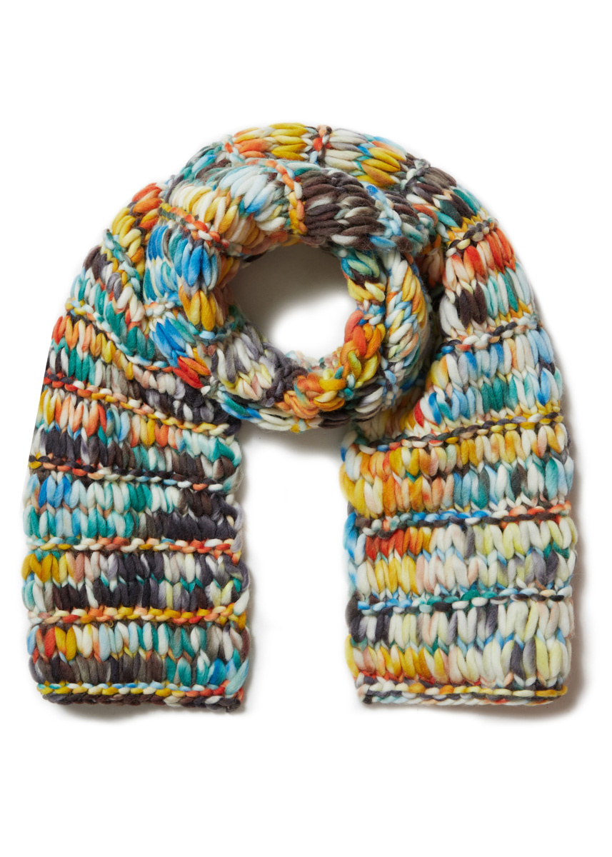 400 г белой суровой/ цвета ржавчины/петрольной/цвета антра- цита/ оранжевой (цв. 7) пряжи Confetti (100% шерсти мерино, 50 м/100 г) фирмы Lana Grossa; прямые спицы № 12